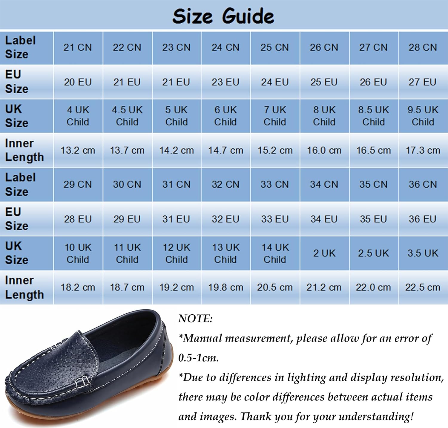 4 UK Child = Label 21 Inner length 13.2 CM — Foot length 12.2-12.7 CM 4.5 UK Child = Label 22 Inner length 13.7 CM — Foot length 12.7-13.2 CM 5 UK Child = Label 23 Inner length 14.2 CM — Foot length 13.2-13.7 CM 6 UK Child = Label 24 Inner length 14.7 CM — Foot length 13.7-14.2 CM 7 UK Child = Label 25 Inner length 15.2 CM — Foot length 14.2-14.7 CM 8 UK Child = Label 26 Inner length 16.0 CM — Foot length 15.0-15.5 CM 8.5 UK Child = Label 27 Inner length 16.5 CM — Foot length 15.5-16.0 CM 9.5 UK Child = Label 28 Inner length 17.3 CM — Foot length 16.0-16.8 CM 10 UK Child = Label 29 Inner length 18.2 CM — Foot length 17.2-17.7 CM 11 UK Child = Label 30 Inner length 18.7 CM — Foot length 17.7-18.2 CM 12 UK Child = Label 31 Inner length 19.2 CM — Foot length 18.2-18.7 CM 13 UK Child = Label 32 Inner length 19.8 CM — Foot length 18.7-19.3 CM 14 UK Child = Label 33 Inner length 20.5 CM — Foot length 19.3-20.0 CM 2 UK = Label 34 Inner length 21.2 CM — Foot length 20.0-20.7 CM 2.5 UK = Label 35 Inner length 22.0 CM — Foot length 20.7-21.5 CM 3.5 UK = Label 36 Inner length 22.5 CM — Foot length 21.5-22.0 CM