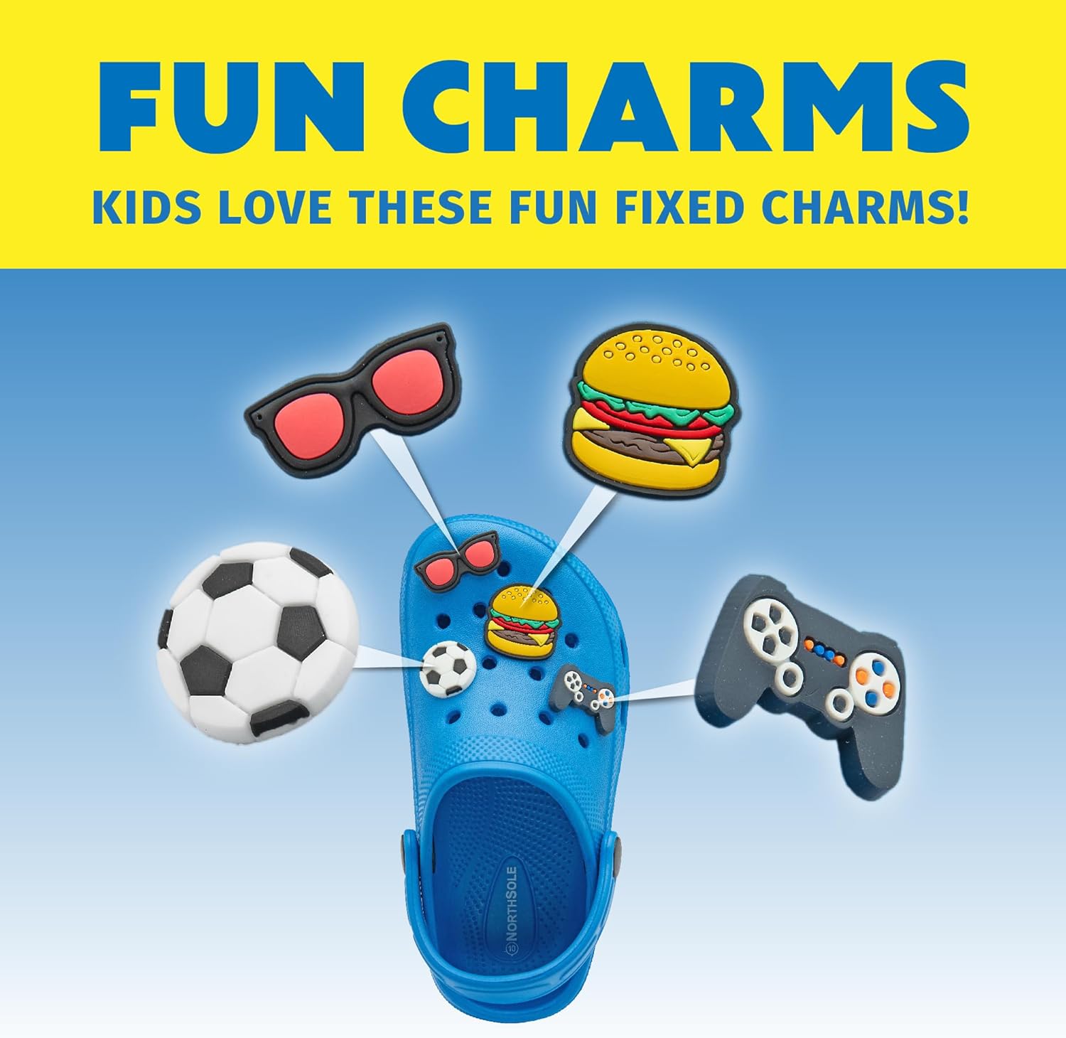 FUNKY CHARMS — These clogs come with funky charms, anything from your favourite gaming controllers to food and sports! The charms are removable if you want just a plain pair of clogs, or want to add your own custom charms.