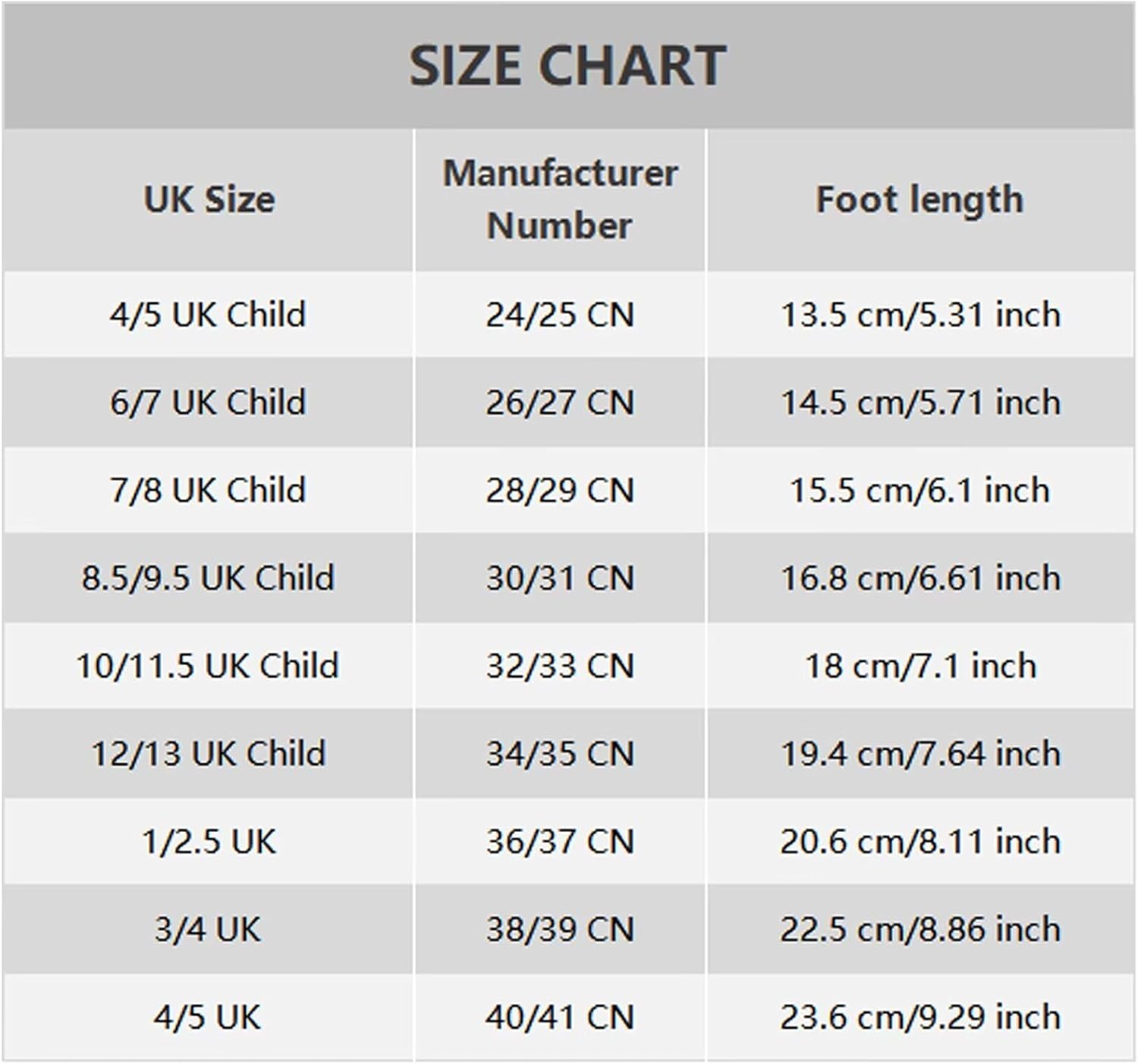 4/5 UK Child ————- Manufacturer number: 24/25 CN ———- Foot length: 13.5 cm