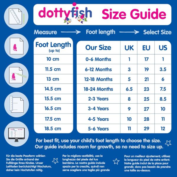 At Dotty Fish, we know how crucial it is to choose the right size for growing feet. Our slippers feature a wide toe box for natural movement and wiggle room. For the best fit, measure your child’s feet using our handy size guide available in the product images. There’s no need to size up; our guide allows room for growth, making it easy to find the perfect fit without the guesswork.