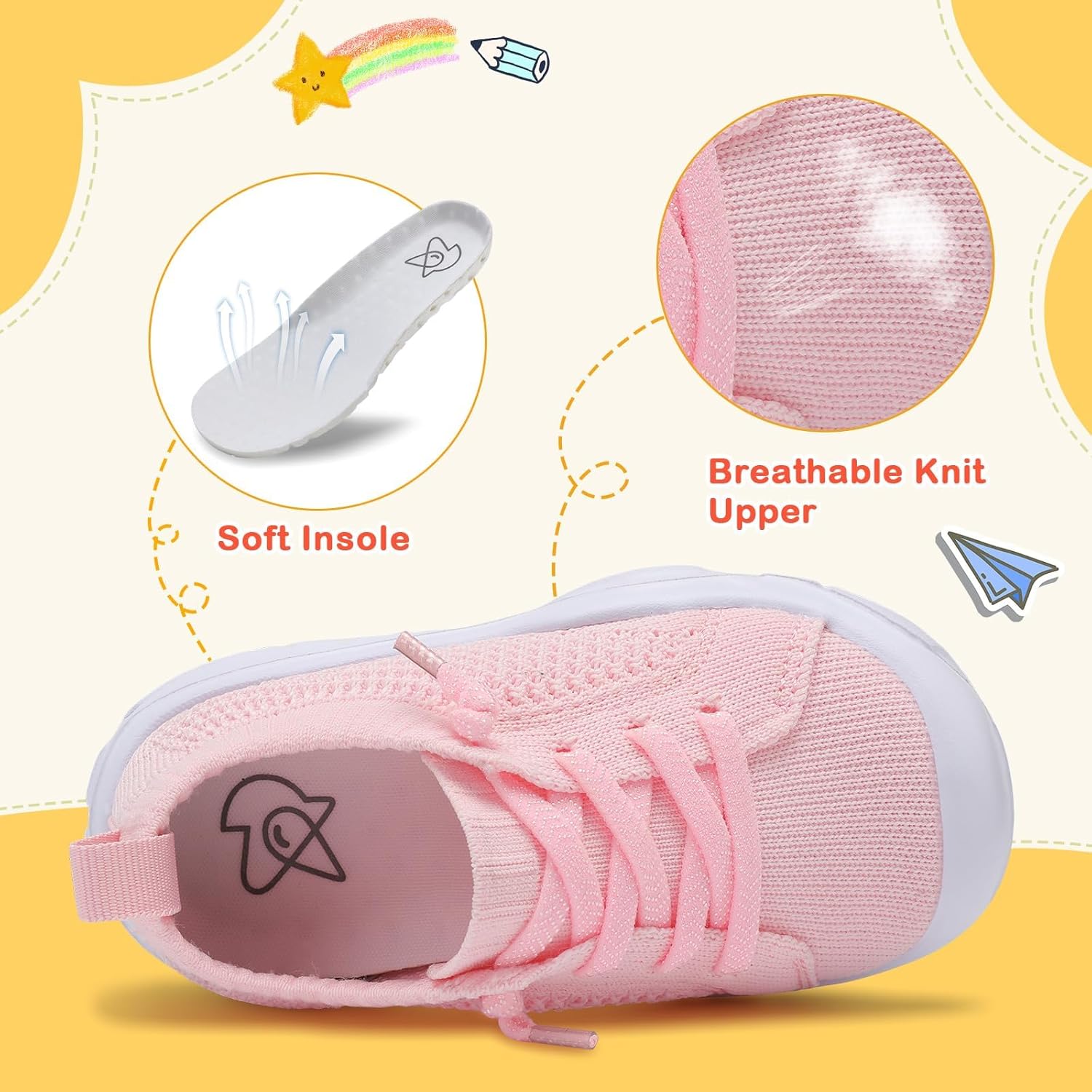 Toddler shoes upper with ultra lightweight knit fabric for breath-ability ensures your kid‘s feet move freely and keep dry.