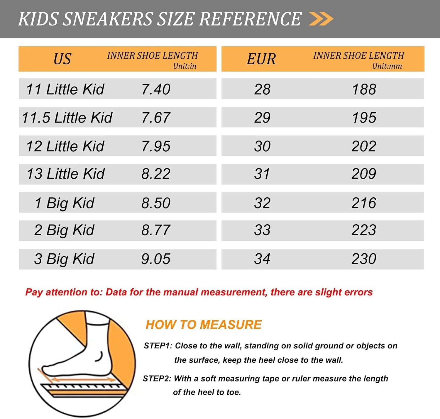 ★ Kids Shoes for Boys Girls Running Sneakers Fashion Trainers ★ UK Size 10 ————— inner Shoes length Insole 188 (mm) / 7.4 Inch. ★ UK Size 10.5————— inner Shoes length Insole 195 (mm) / 7.67 Inch. ★ UK Size 11 ————— inner Shoes length Insole 202 (mm) / 7.95 Inch. ★ UK Size 12 ————– inner Shoes length Insole 209 (mm) / 8.23 Inch. ★ UK Size 13 ————— inner Shoes length Insole 216 (mm) / 8.5 Inch. ★ UK Size 1 ————— inner Shoes length Insole 223 (mm) / 8.77 Inch. ★ UK Size 2 ————— inner Shoes length Insole 230 (mm) / 9.05 Inch. ★ Very suitable for running, leisure, walking, beach, sports, travel, summer, spring, autumn, winter, relaxing at home, daily wear, suitable for any sports activities ★ Please allow little color difference due to different camera or light environment. ★ Please check our size chart before buying ! ★
