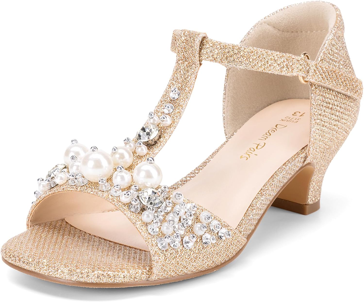 DREAM PAIRS Girls Sandals Ankle Strap T-Strap Low Heel Pearl Bow Flower Pump Dress Wedding Party Shoes for Little Kid/Big Kid