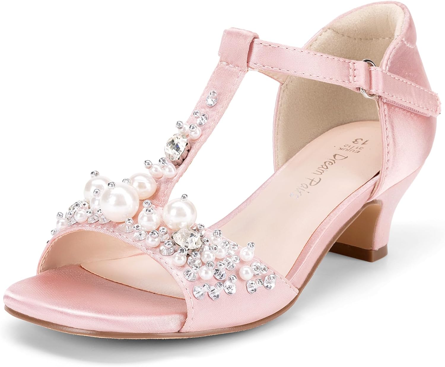 DREAM PAIRS Girls Sandals Ankle Strap T-Strap Low Heel Pearl Bow Flower Pump Dress Wedding Party Shoes for Little Kid/Big Kid