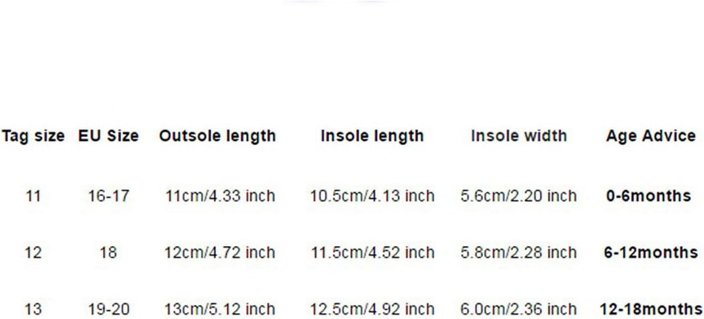13 19-20 13/5.12 12.5/4.92 6/2.36 12-18 Months