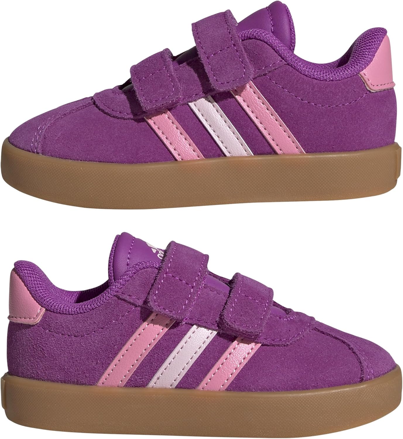 Adventure ready. These infant’s adidas shoes have adjustable hook-and-loop straps so you can get them on and off in a flash, perfect for feet that don’t want to stop moving. A synthetic upper, textile lining and vulcanised rubber outsole come together to keep their feet comfortable whether they’re learning to stand, cruise or play.