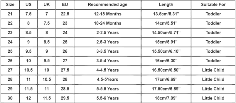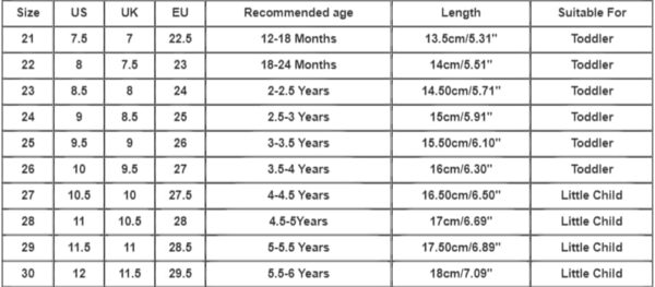 Size note :In order to find the size that suits your kid, please measure your kid’s foot length before buying