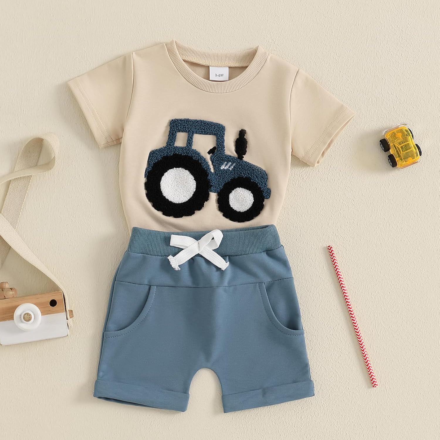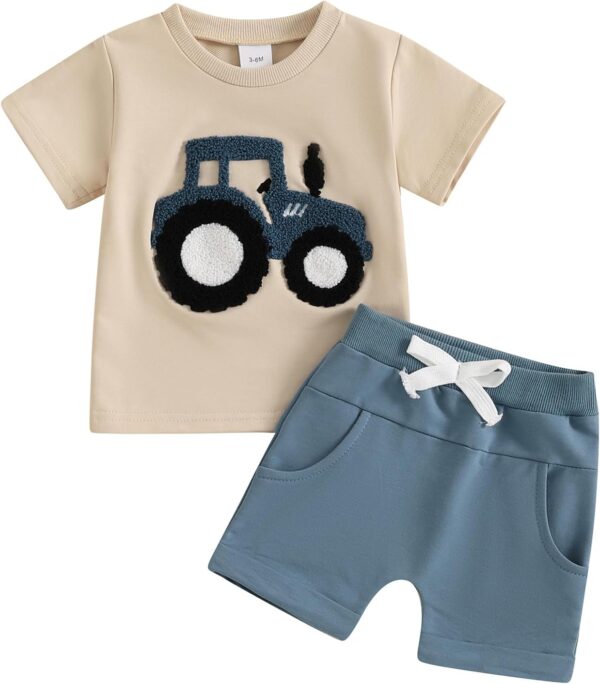 BeliBacca Baby Boy Summer Clothes Tractor Embroidery Short Sleeve Crop Shirt Tops Drawstring Shorts Set Infant Toddler Boy 2pcs Truck Outfits