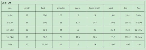 0-6M Tops Length: 12.2 Bust: 19.68 Sleeve: 3.74 Shoulder: 7.87 Pants Length: 9.06 Waist: 14.96 Hip: 22.05 Advised Age: 0-6 Months