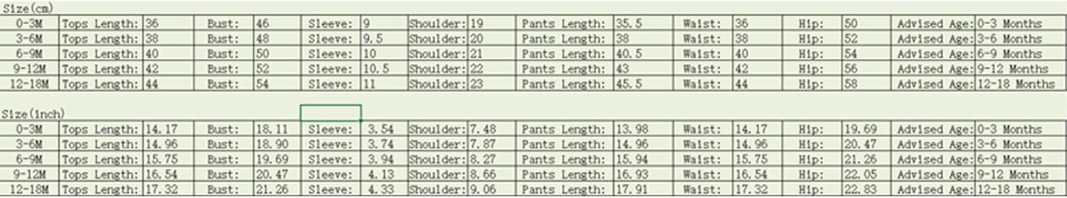 3-6M Bust: 20.47 Sleeve: 3.74 Pants Length: 15.94 Waist: 15.75 Romper Length: 15.55 Suggest Age: 3-6 Months