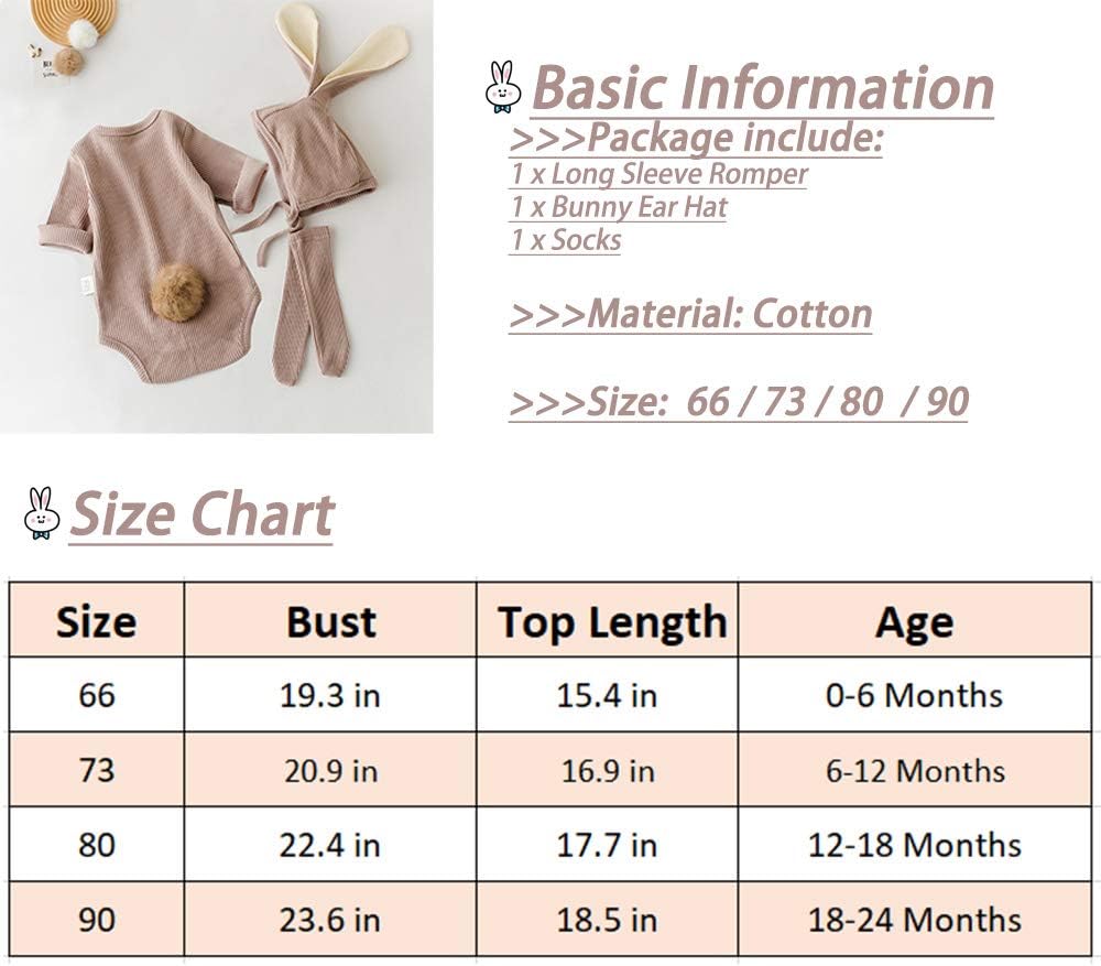 Fashion and beautiful Infant first Easter Day outfits matching 3D rabbit ear hat & Removable cute fur ball bunny tail set will be the best gift for baby boys girls. Makes your baby adorable and attractive, brighten Easter Day. Unique fashionable 3D rabbit ears hat & 3D removable cute plush bunny tail can add an adorable element to the look. Pretty bunny ear & tail pattern on the bodysuit is lovely and exquisite. It can bring hope to infants.The infant baby boys girls Easter outfits is made of high quality soft cotton. Super soft and comfortable to the touch, breathable and skin-friendly for babies. Round neckline makes it easy to put on and off the jumpsuit and give baby a comfy and cozy breath. The crotch uses snap button design with high quality sewing skills simplifies dressing steps and makes process of changing diapers easier. Our baby boys and girls bunny bodysuit set is a great gift choice for newborn and toddlers. Your little babies will love this beautiful bodysuit on First Easter Day for celebration. It is suitable for daily casual indoor and outdoor wear, stage performance, photography props, dancing customs, Easter party, Halloween party and etc. The Infant Baby Boys Girls Easter Outfit included 1 x Romper, 1 x Bunny ear hat, 1 x Socks. My first Easter baby boys girls outfits is suitable for 0-3 Months,3-6 Months, 6-12 Months,12-18 Months, 18-24 Months newborn baby boys girls and infant baby boys girls and toddler boys girls. And you can choose the right size according to the size chart.