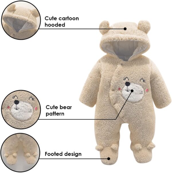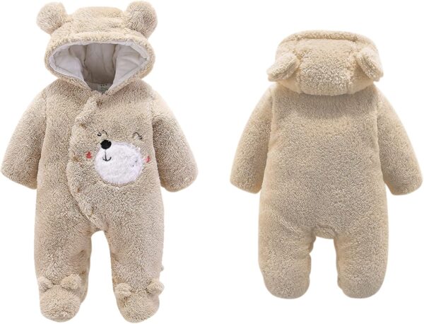 Customers find the snowsuit looks like the picture, is soft and cuddly, and is warm for winter. They like the color and Teddy motifs. The fit is good, though opinions differ on the quality.