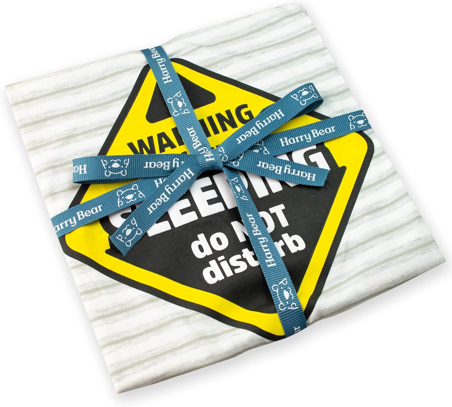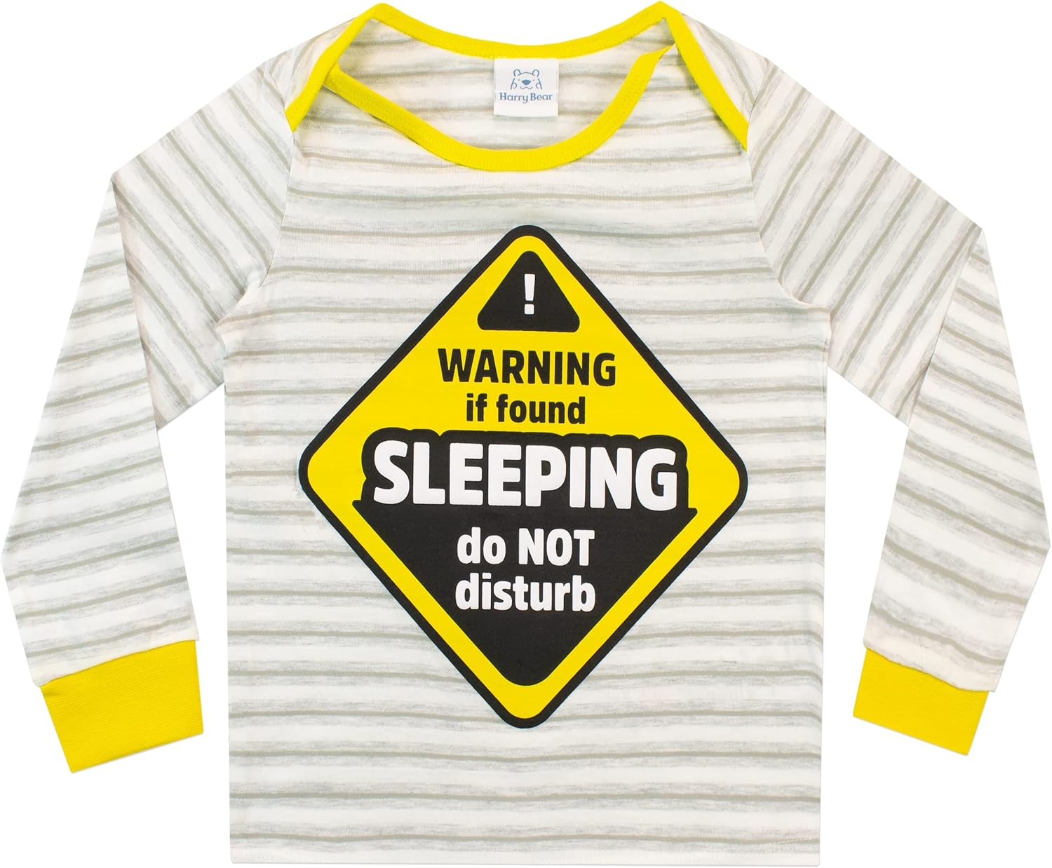 Kids Do Not Disturb PJs. After a day of exploring and playing your little one will need a good sleep – thankfully these adorable jammies will remind everyone to leave them in peace! Designed by Harry Bear, this white and grey stripy pyjama set features a high build print of the slogan ‘Warning if found sleeping do not disturb’ over a vibrant yellow warning sign. Both the pyjama top and the comfy matching pj bottoms have yellow elasticated cuffs for extra cosiness. Your sleepy infant will look super cute in these jammies! Finished with a hand-tied Harry Bear ribbon to make the perfect gift.
