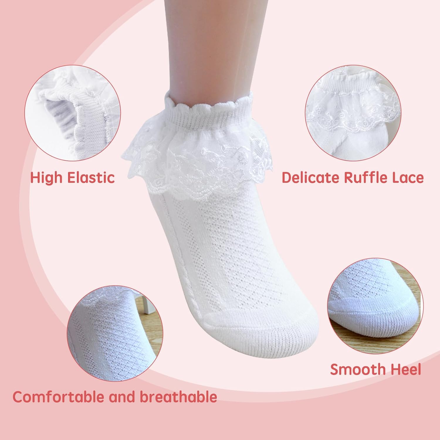 6 Pairs Girls Lace Socks,Baby Frilly Socks Ankle Socks,Children’s Frilly School Socks with Lace,White Ballet Ruffle Lace Socks