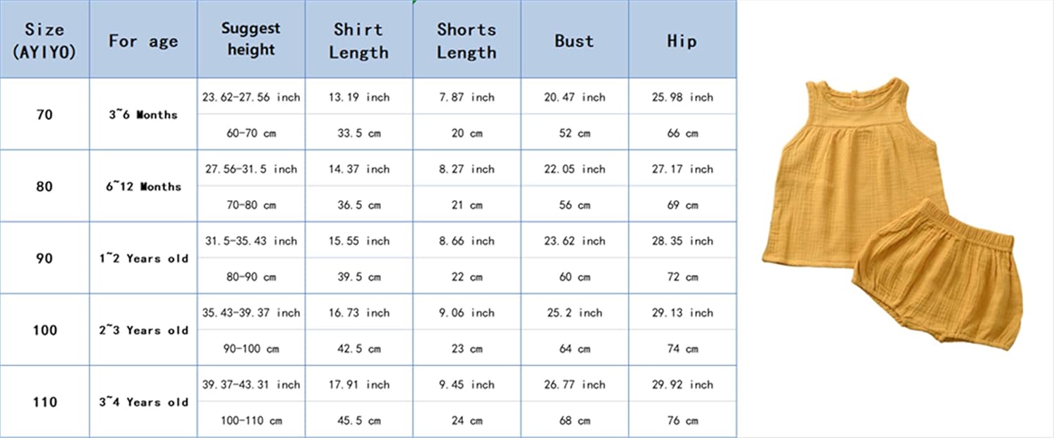 AYIYO Toddler Outfits Unisex Girls Boys Baby Cotton Linen Blend Tank Tops and Bloomers Specification : Cotton linen Color:Blue,Green,Yellow,Pink,White Please check the size details before you buy it,Thanks!Package includes: 1x baby jumpsuit Material: Cotton linen Occasions:Suitable for summer outdoor wear and daily wear,perfect for any occasions such as home, school,outside,beach,holiday,sleep etc. About Shipment: Fulfilled by Amazon: 2 days to arrive. Standard Shipping: 9-25 biz days to arrive. Due to different measuring way, the size may exist 0.4-1.2″ errors. Due to different computers display colors differently, the color of the actual item may vary slightly from the above images, thanks for your understanding.