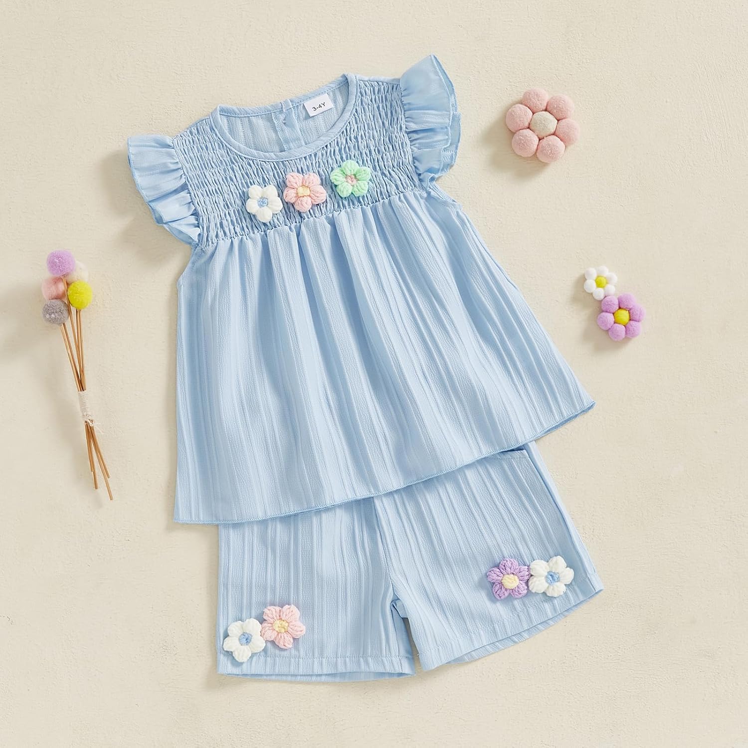 Baby Girl Summer Clothes 3D Flower Embroidery Smocked Tunic Top Casual Shorts Set 2Pcs Toddler Summer Outfit 9M-4Y