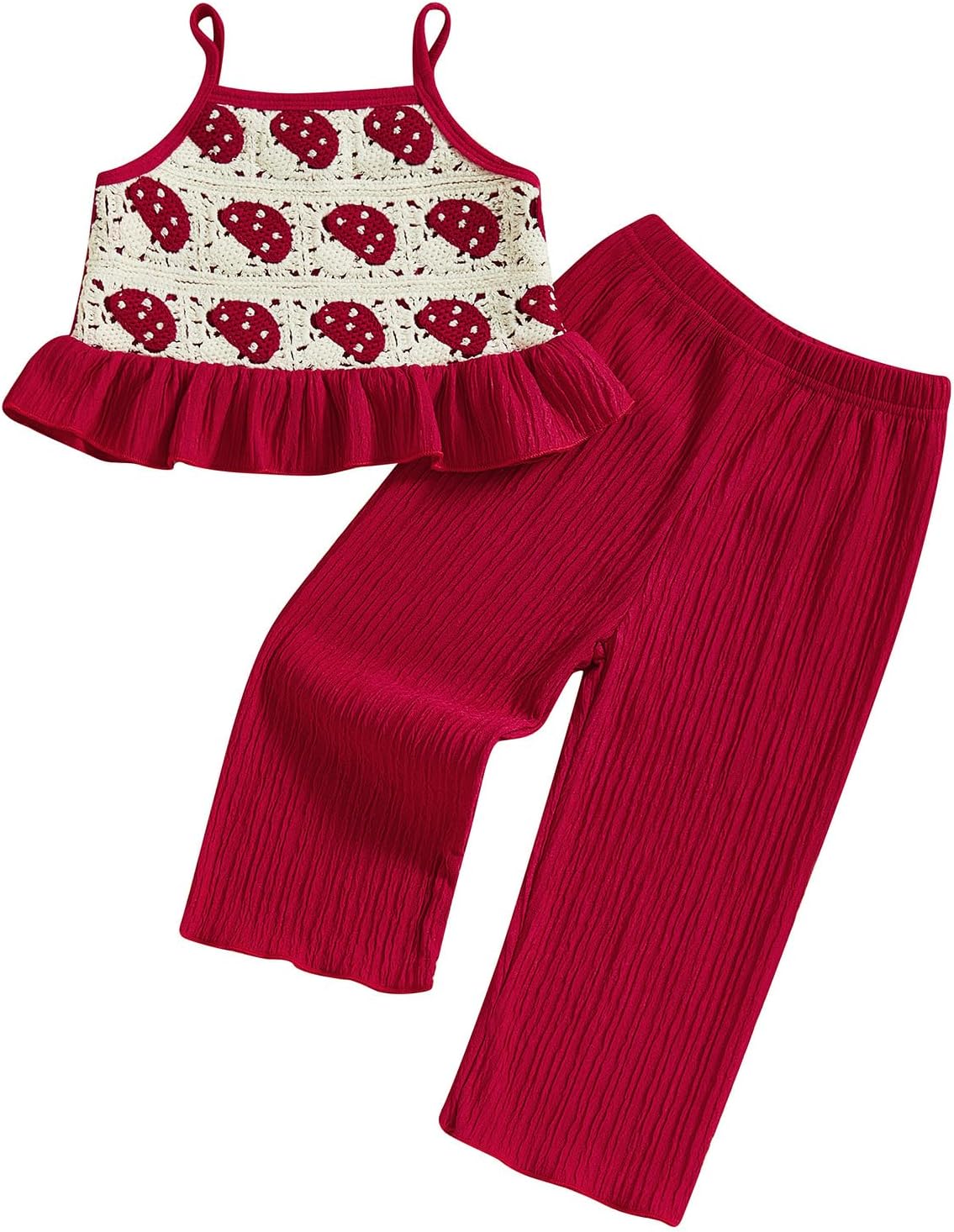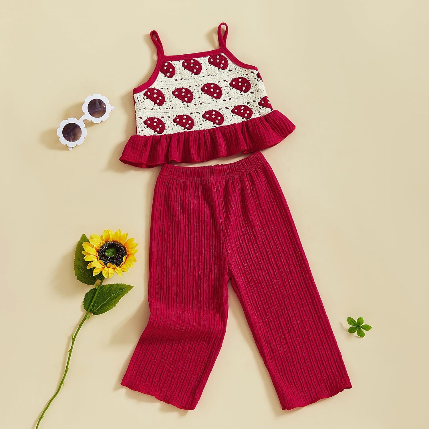 Girls fashion outfit; Baby girl camisole with crocheted flowers/fruits, ruffled hem, spaghetti straps and sleeveless design; Baby girl pants with elastic waist design for easy fit; Your little girl will love such a cute outfit