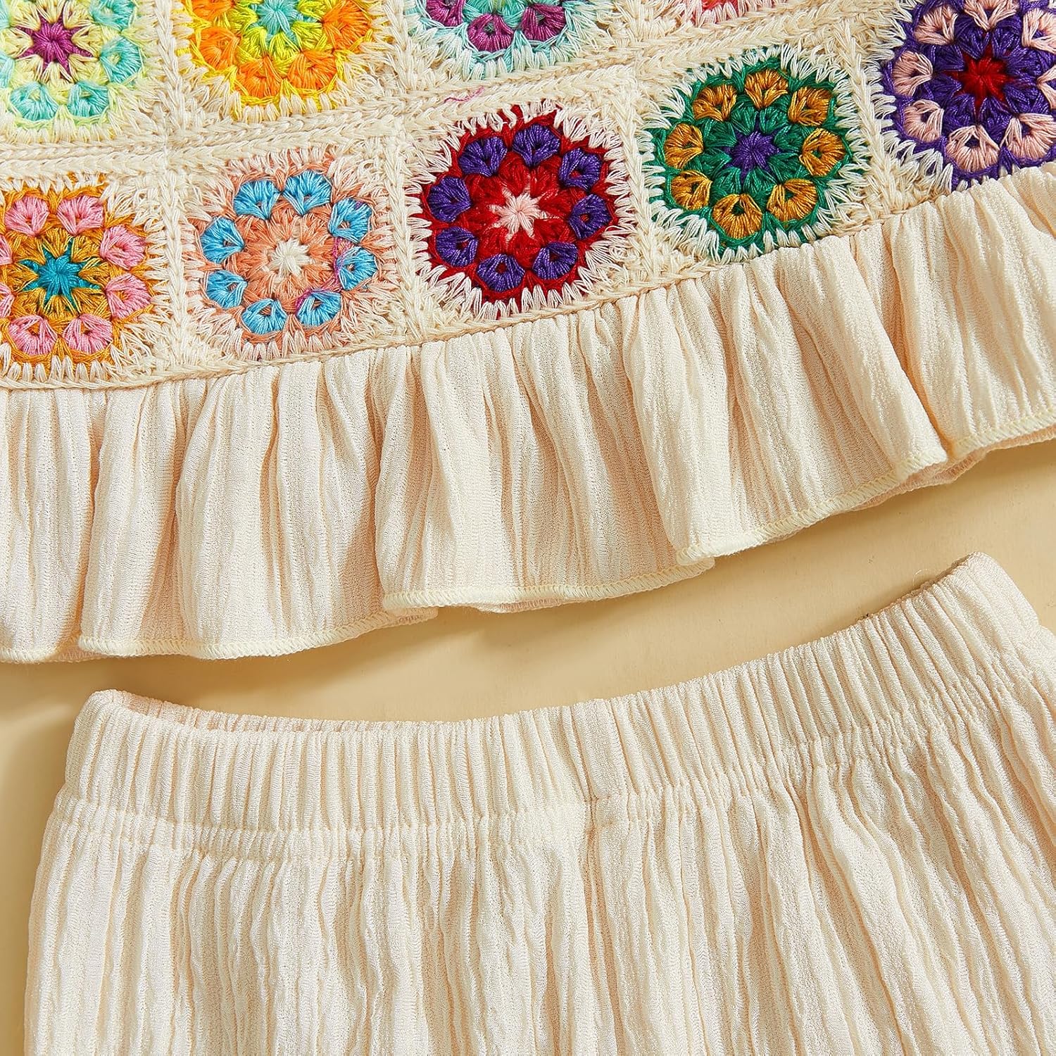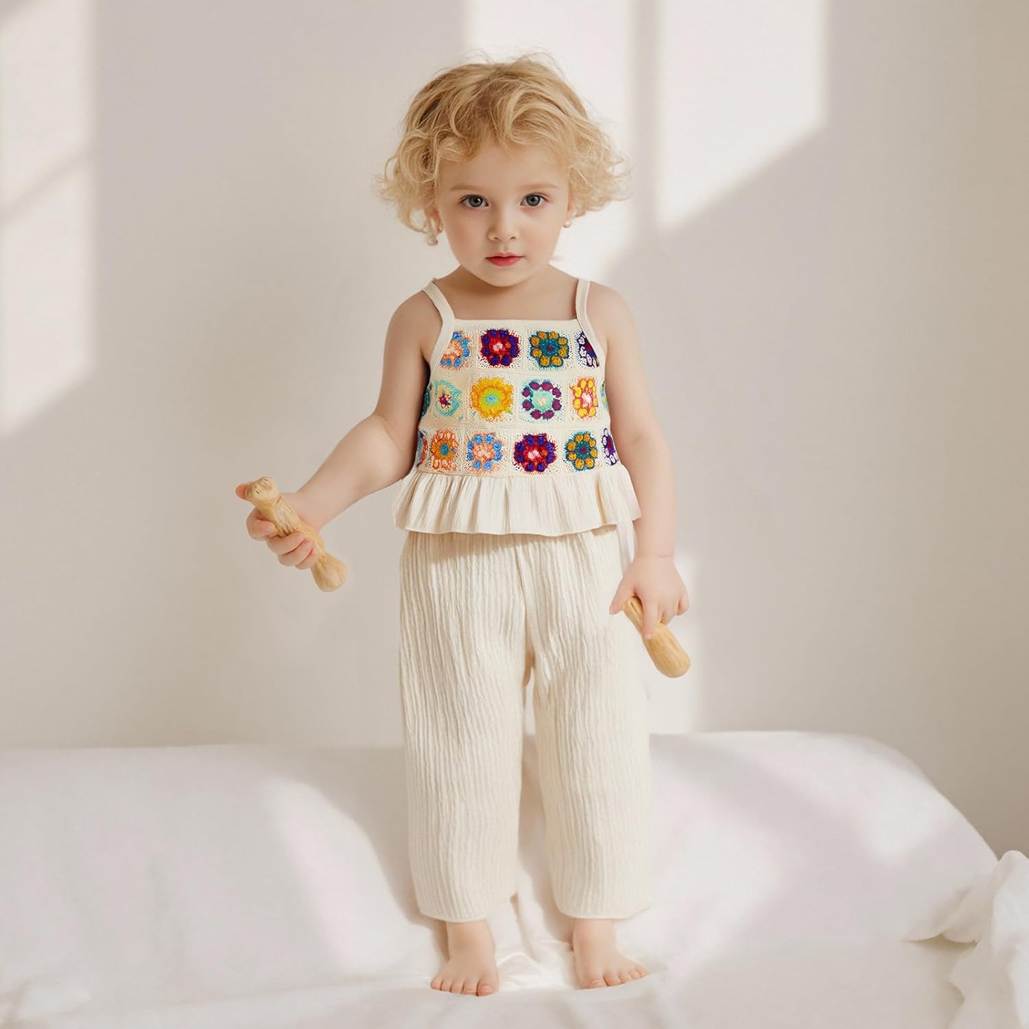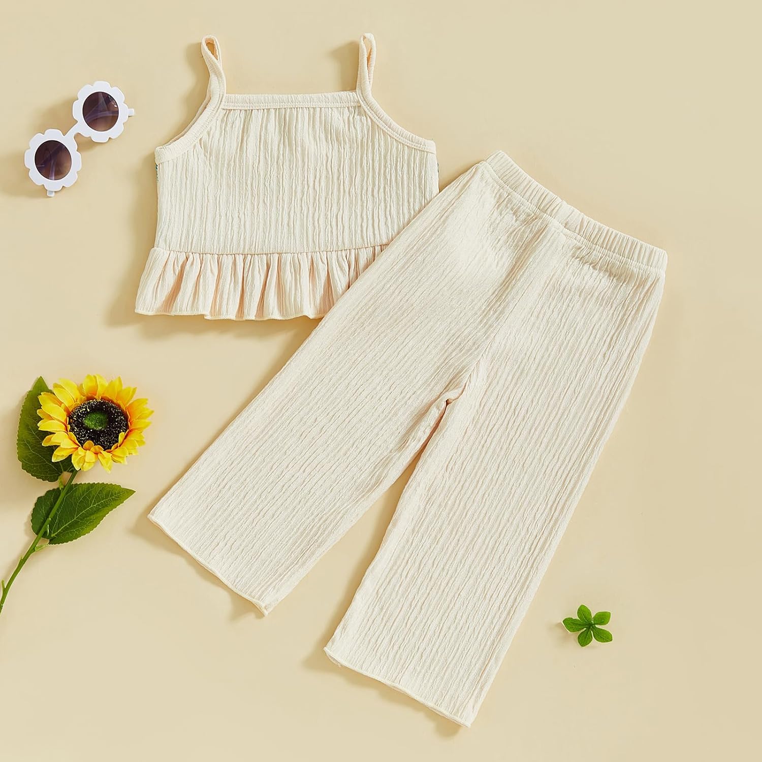 Girls fashion outfit; Baby girl camisole with crocheted flowers/fruits, ruffled hem, spaghetti straps and sleeveless design; Baby girl pants with elastic waist design for easy fit; Your little girl will love such a cute outfit