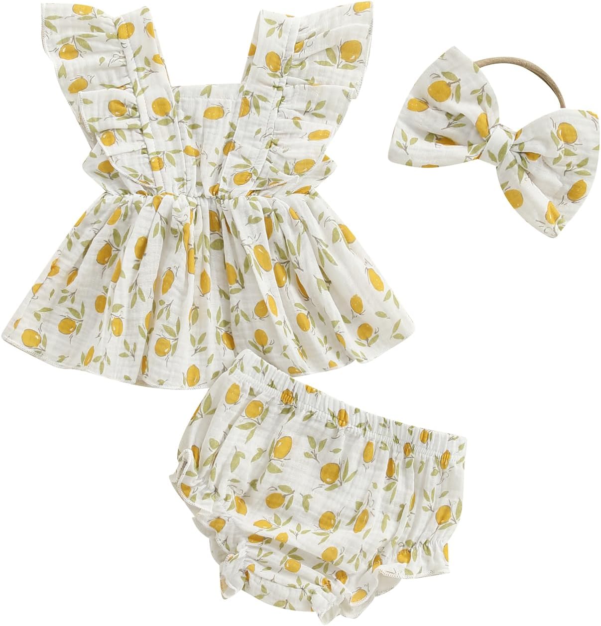 Baby Girl Summer Outfit Strawberry/Cherry/Lemon Smocked Tunic Tops Ruffle Bloomer Shorts Headband Cute 3Pcs Newborn Coming Home Summer Clothes 0-18M