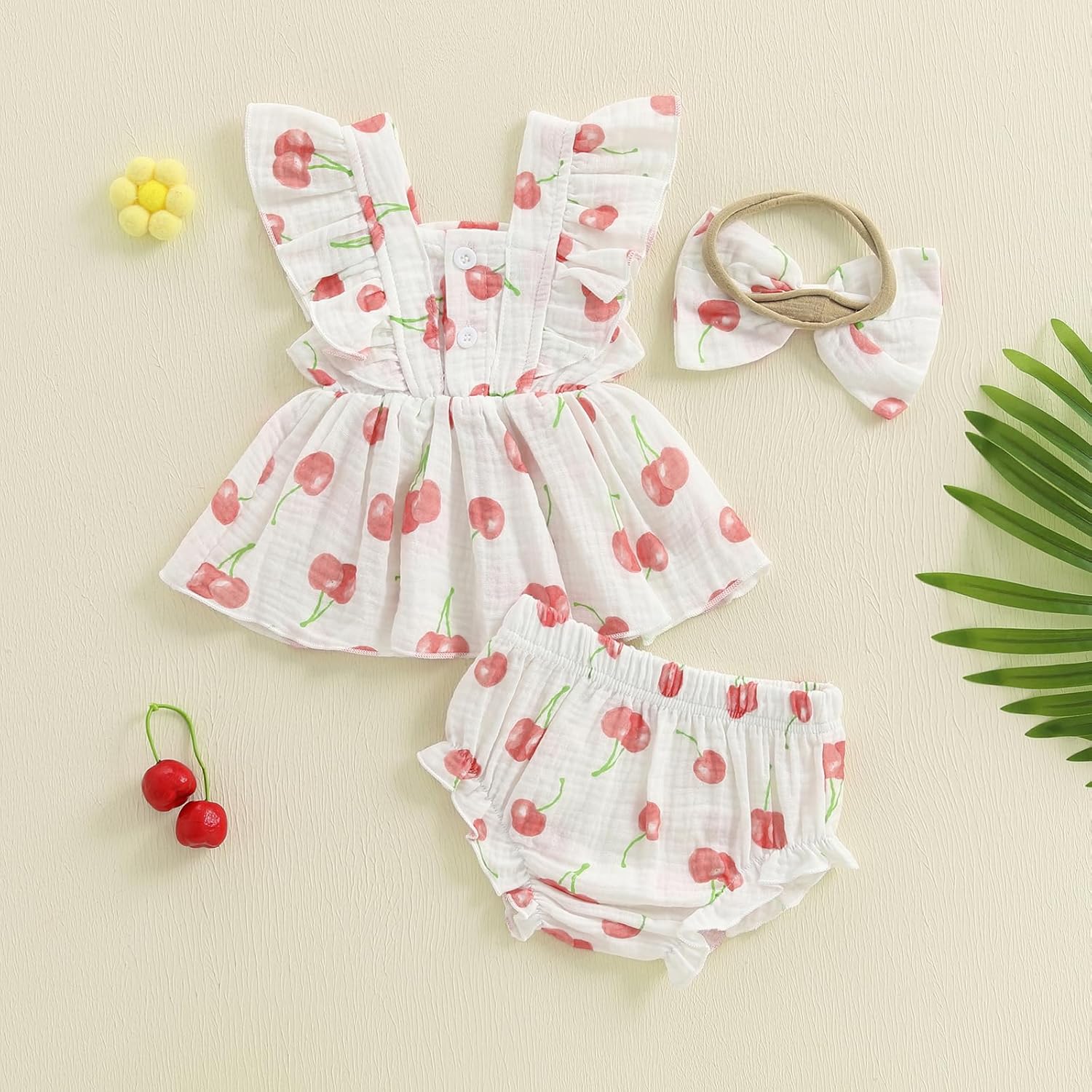 Baby Girl Summer Outfit Strawberry/Cherry/Lemon Smocked Tunic Tops Ruffle Bloomer Shorts Headband Cute 3Pcs Newborn Coming Home Summer Clothes 0-18M
