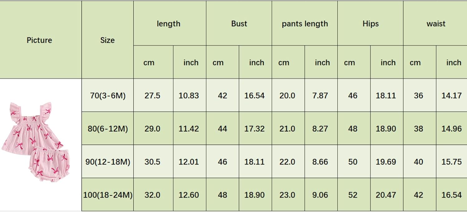 70 Tops Length: 10.83 Bust: 16.54 Shorts Length: 7.87 Waist: 14.17 Hip: 18.11 Advised Age: 3-6 Months