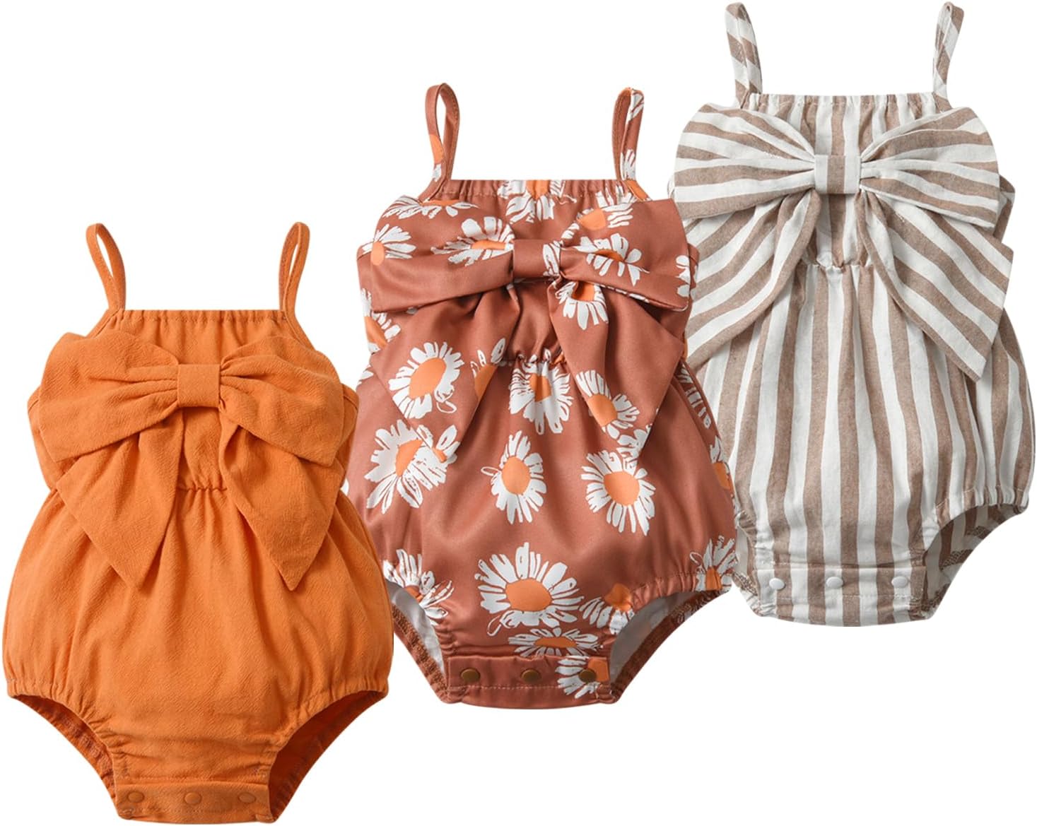Derouetkia Baby Girl Romper Summer Tank Top Suspender with Bow Design Cute Baby Girl Jumpsuit 3Pcs