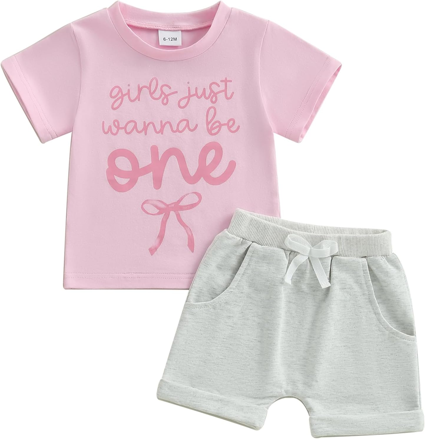 Domisola Baby Girl First Birthday Outfits Letter Print Short Sleeve T-shirt Tops Pants Shorts Set Infant Summer Clothes