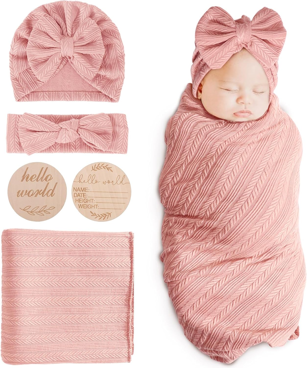 DRESHOW Newborn Baby Blanket Soft Swaddle Blankets for Infant Swaddling Receiving Warm Wraps with Bow Hat Headband