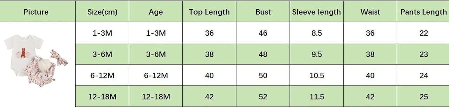 1-3M Advised Age: 1-3 Months Romper Length: 14.17 Bust: 18.11 Pants Length: 8.66 Waist: 14.17 Sleeve: 3.35