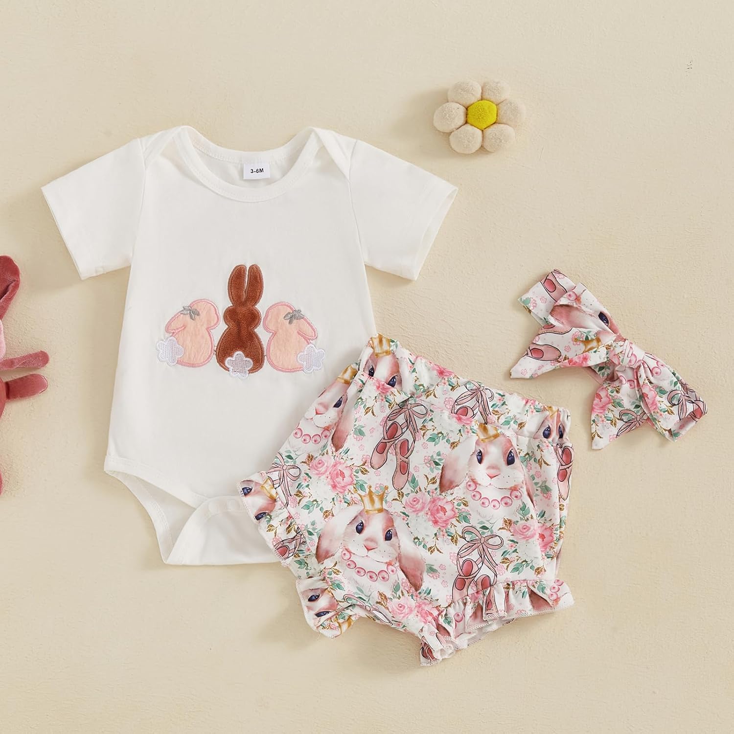 Baby girl Easter outfit with cute bunny print; Baby girl romper with short sleeves and round neckline; Baby girl shorts with plush poms, elastic waist design, and cute headband set; Little princess will love its cute design