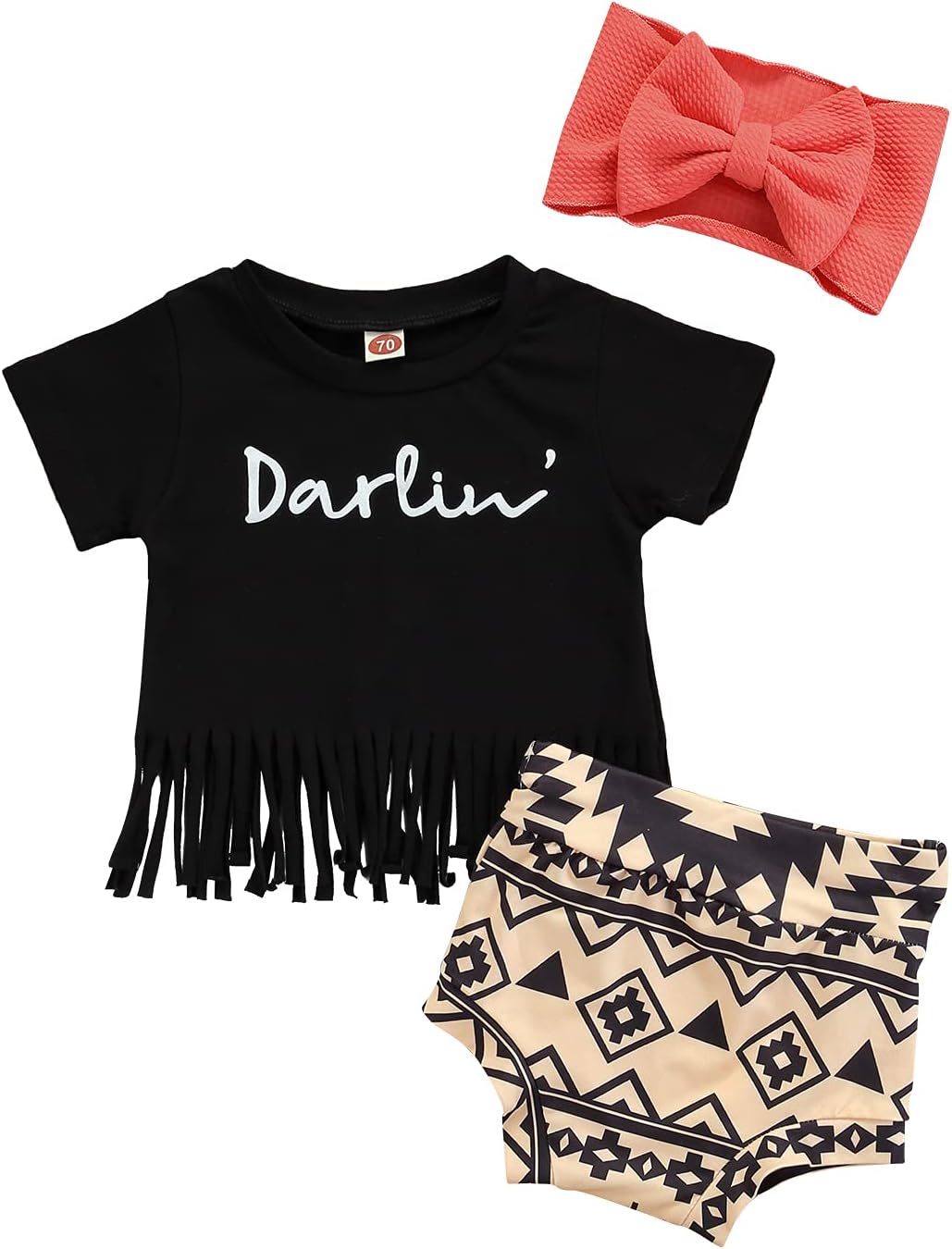 Fabumily Newborn Baby Girl Clothes Set Letter Short Sleeve Tassel T Shirt Bloomer Shorts Headband 3Pcs Infant Summer Outfits