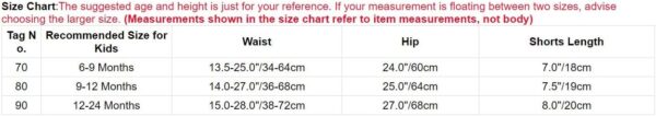 Tag No.—|—Recommended Size for Kids—|———-Waist———|——-Hip——|—Shorts Length