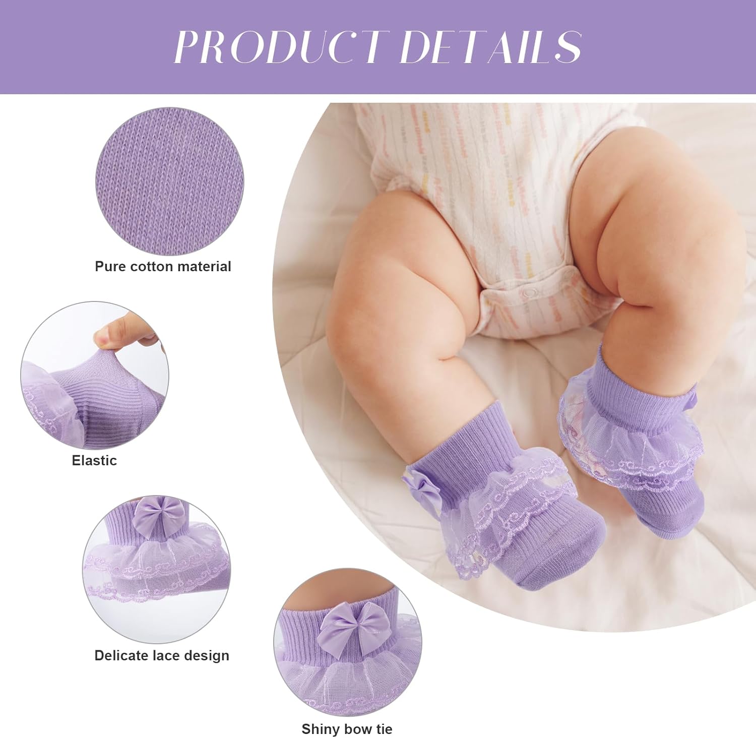 FRIUSATE 9 Pairs Baby Girl Frilly Socks, White Lace Soft Comfortable Cotton Colorful Lace with Bowknot Ankle Socks for Newborn Baby Girls