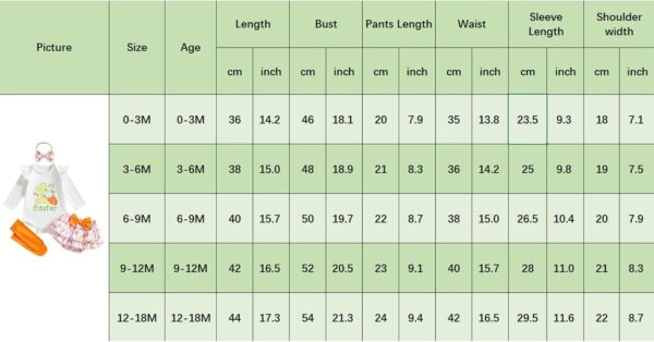 0-3M Tops Length: 14.17 Bust: 18.11 Sleeve: 9.25 Shoulder: 7.09 Pants Length: 7.87 Waist: 14.17 Advised Age: 0-3 Months