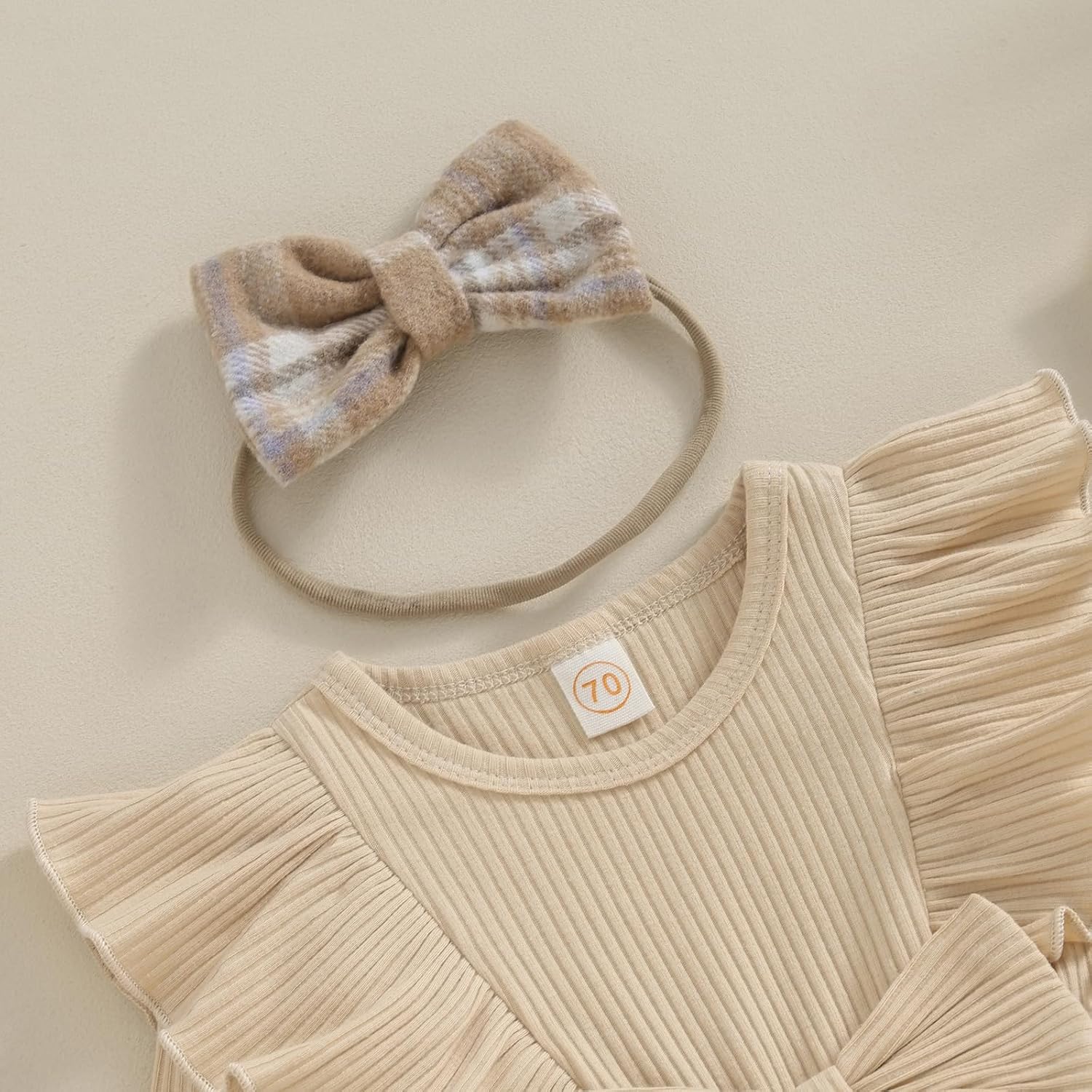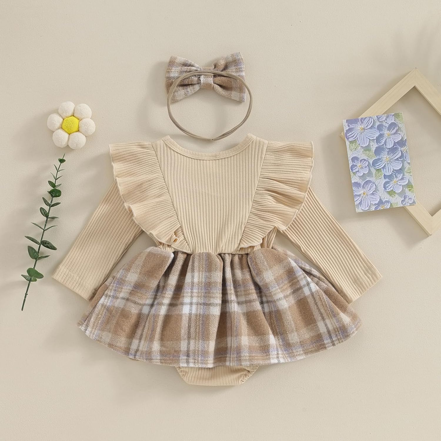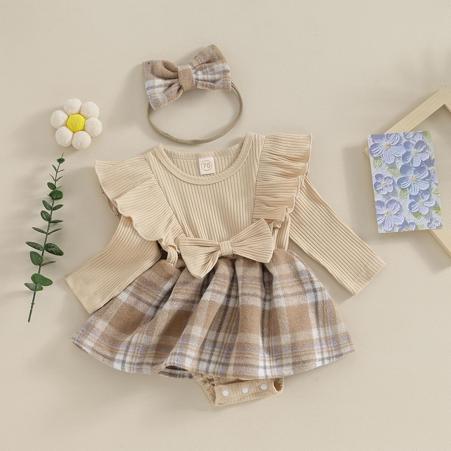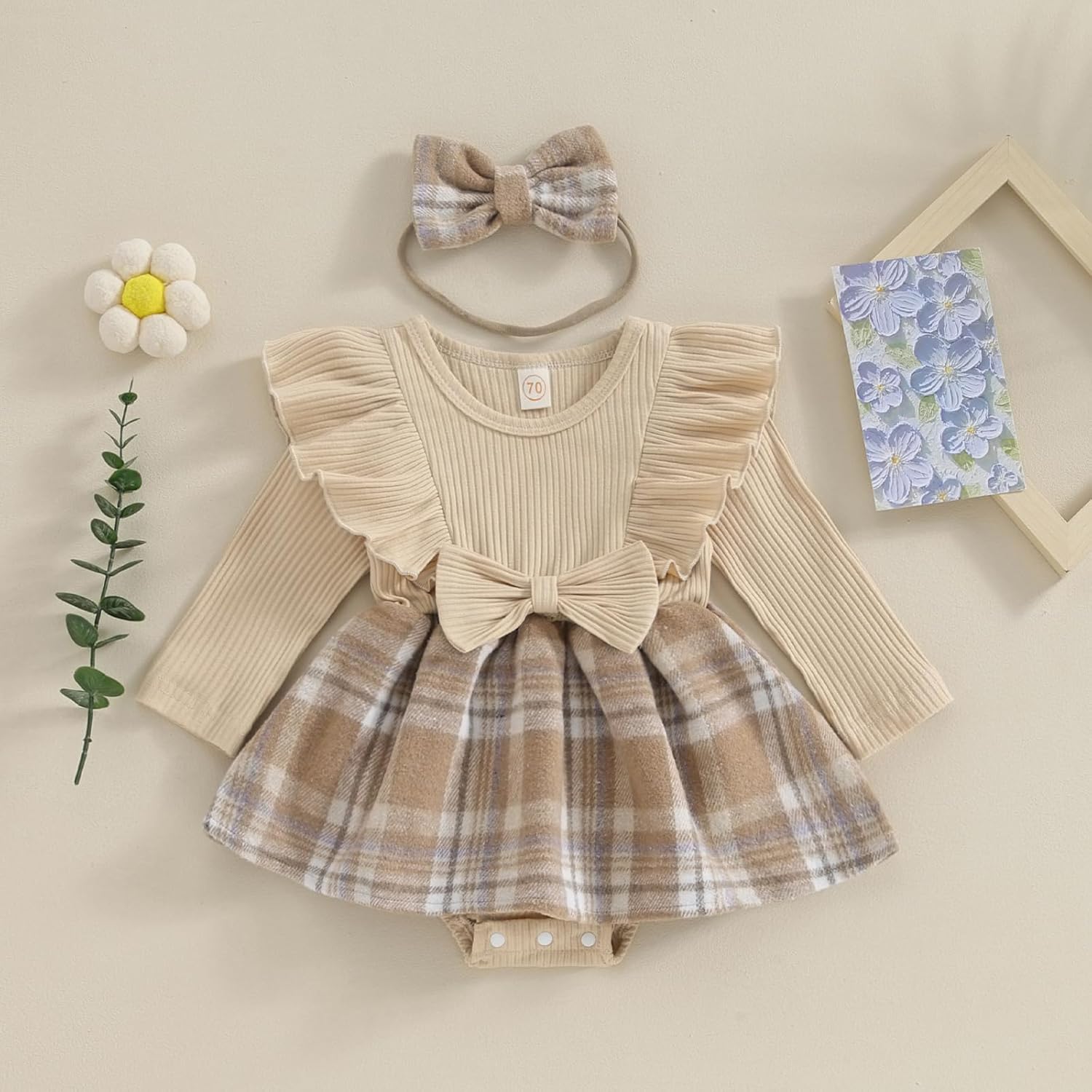 Infant Baby Girls 2Pcs Dress Outfits Ruffle Long Sleeve Plaid Print Skirt Romper with Headband Set Cute Fall Short Skirt Set