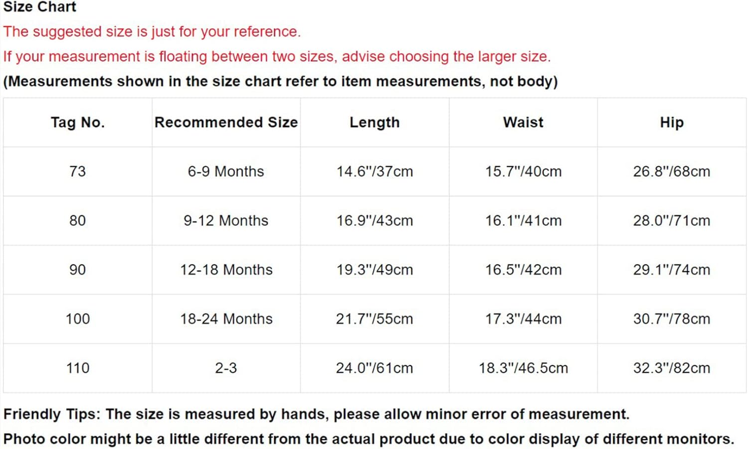Tag No.—|—Recommended Size—|——Length—–|——-Waist——-|——-Hip—-