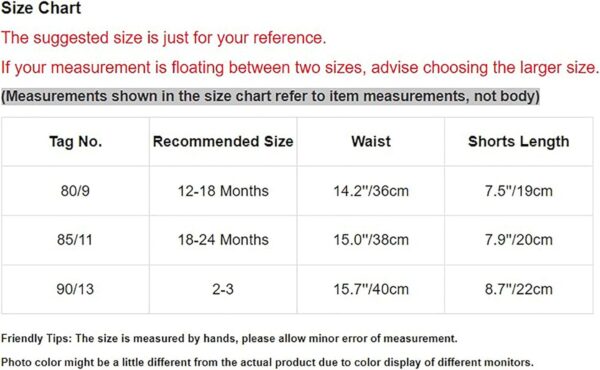 Tag No.—|—Recommended Size—|——Waist——|—Shorts Length