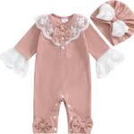 Baby Girl Summer Clothes Set, Ruffle Short Sleeve Rib Knit Romper + Floral Shorts + Headband Set