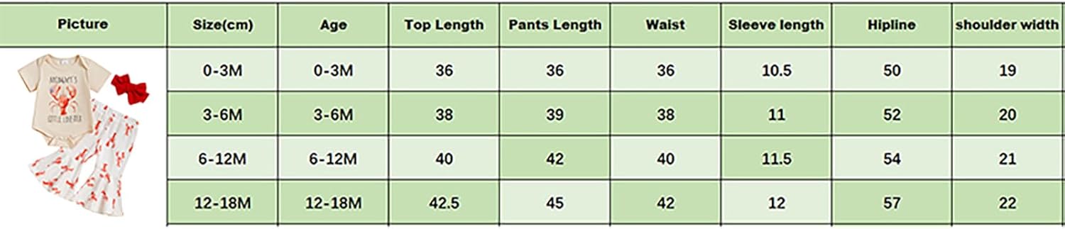 3-6M Tops Length: 38 Bust: 48 Sleeve: 11 Shoulder: 20 Pants Length: 39 Waist: 38 Hip: 52 Advised Age: 3-6 Months