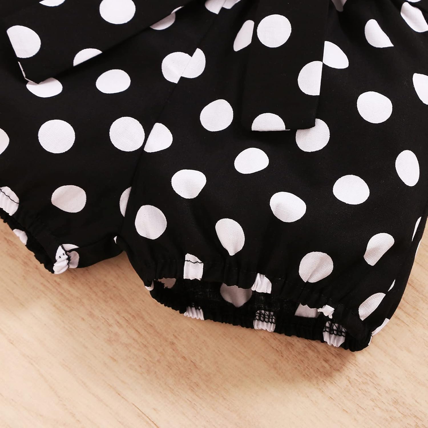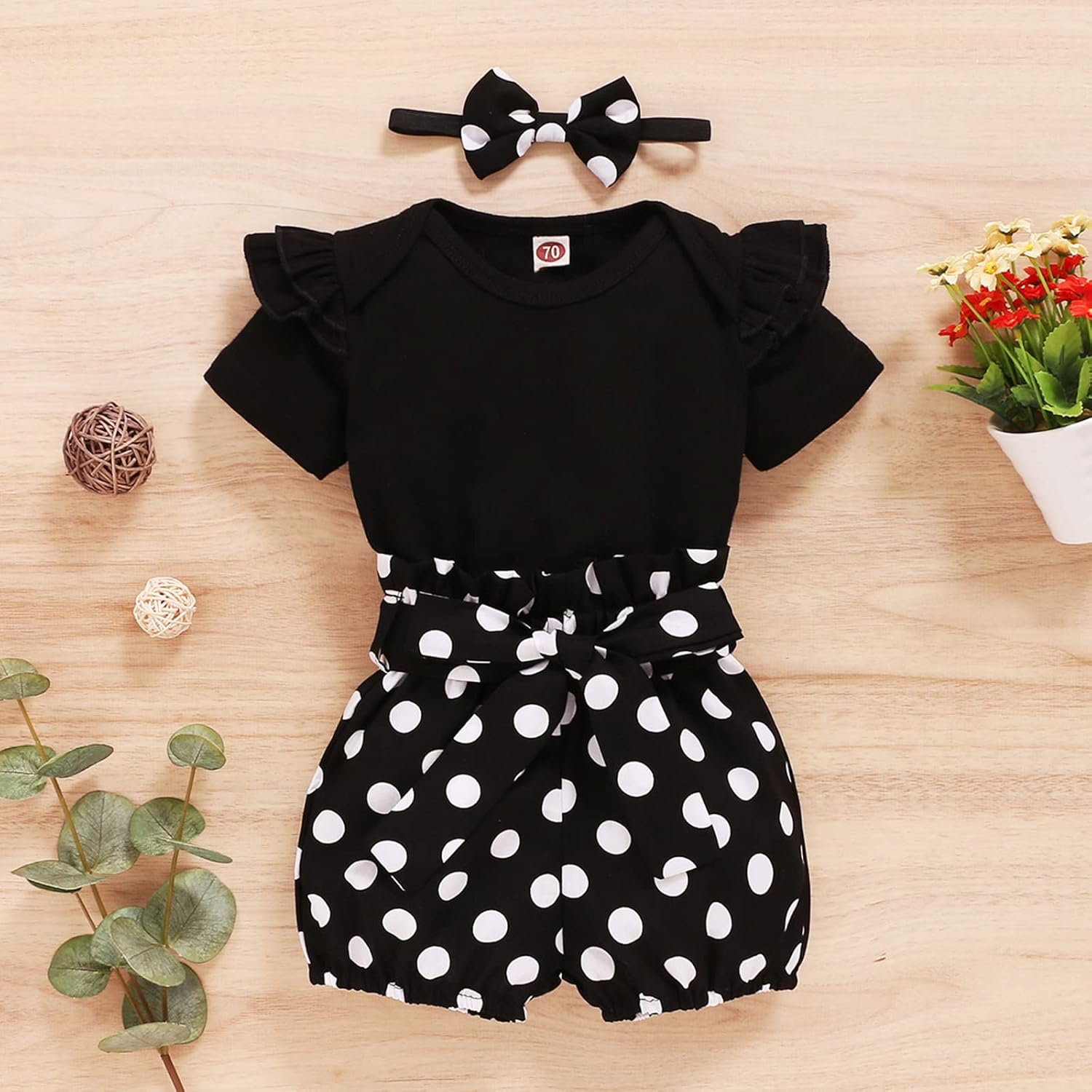 Newborn Baby Girl Set Ruffled Sleeve Romper Polka Dots Shorts Bloomers Bowknot Headband Boutique Clothes, Yxx017a-black, 0- 3 Months