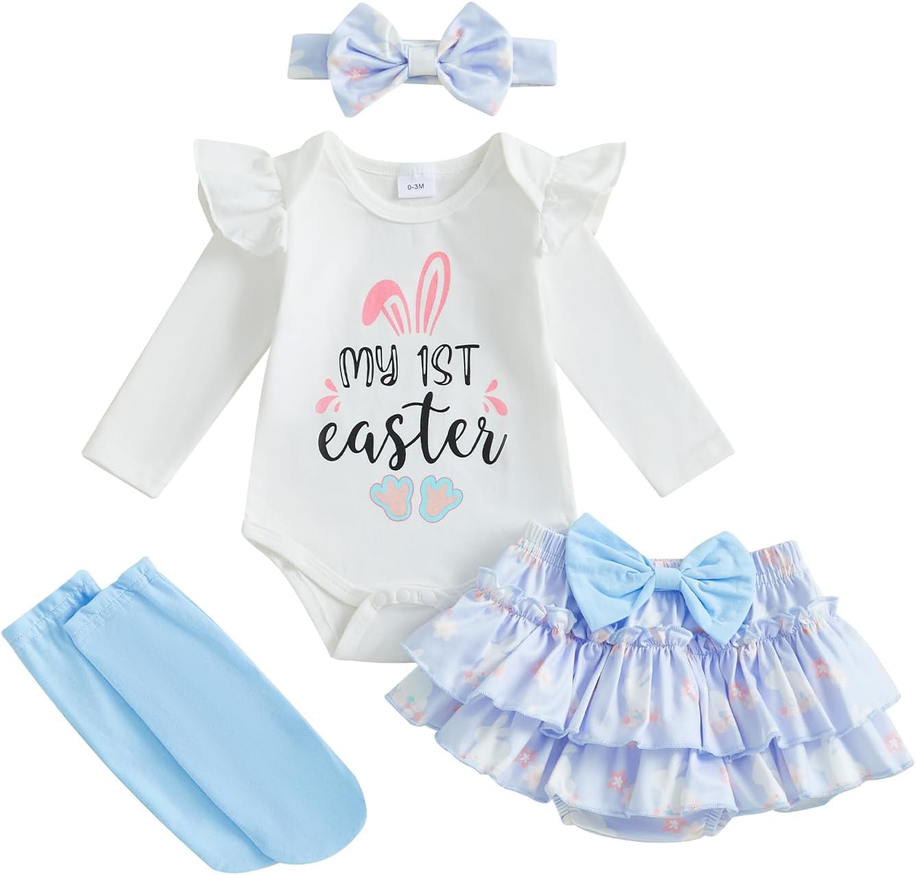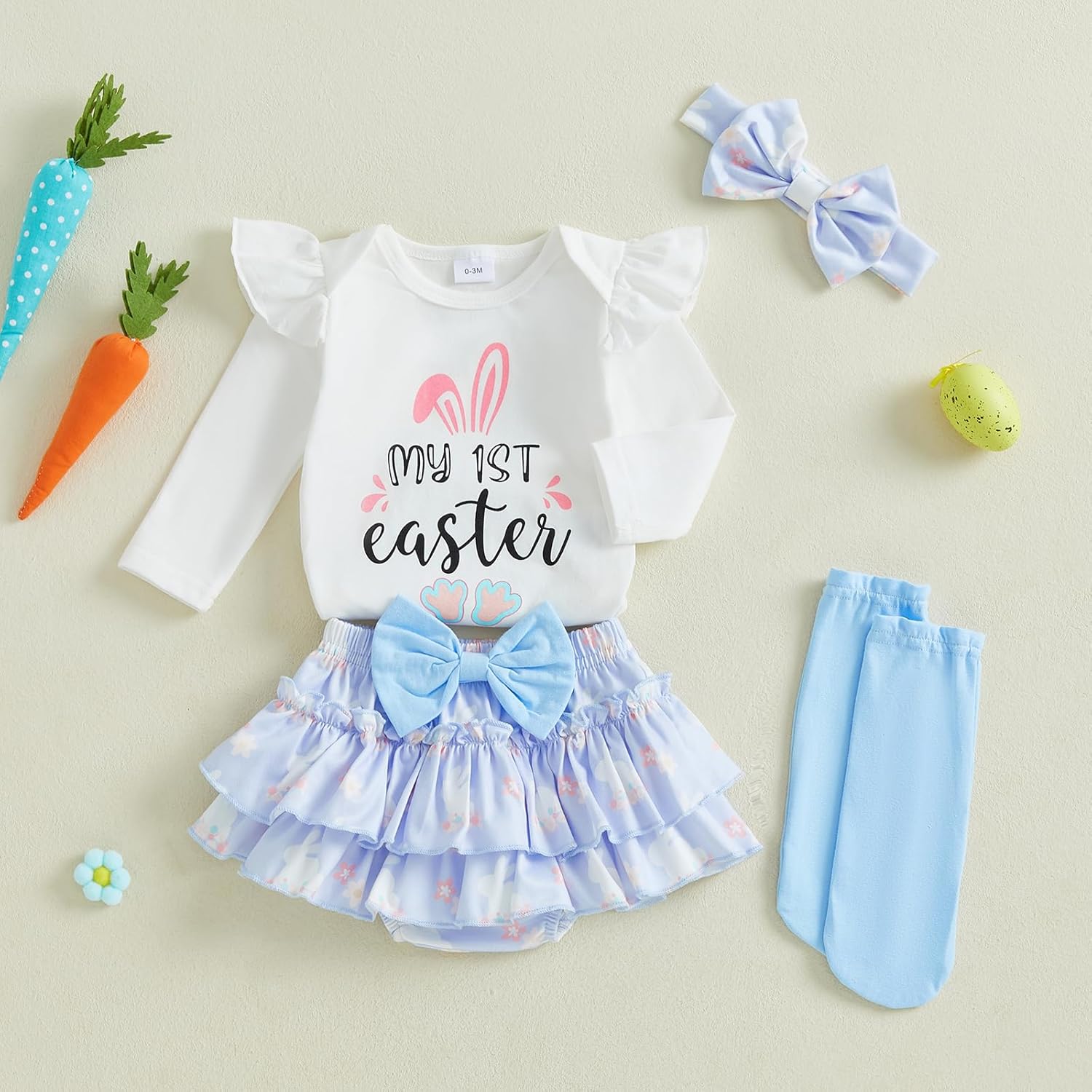 Qianderer Newborn Baby Girl Easter Outfit Bunny Clothes Long Sleeve Romper+Bloomers Tutu Skirt+Socks+Headband 4Pcs