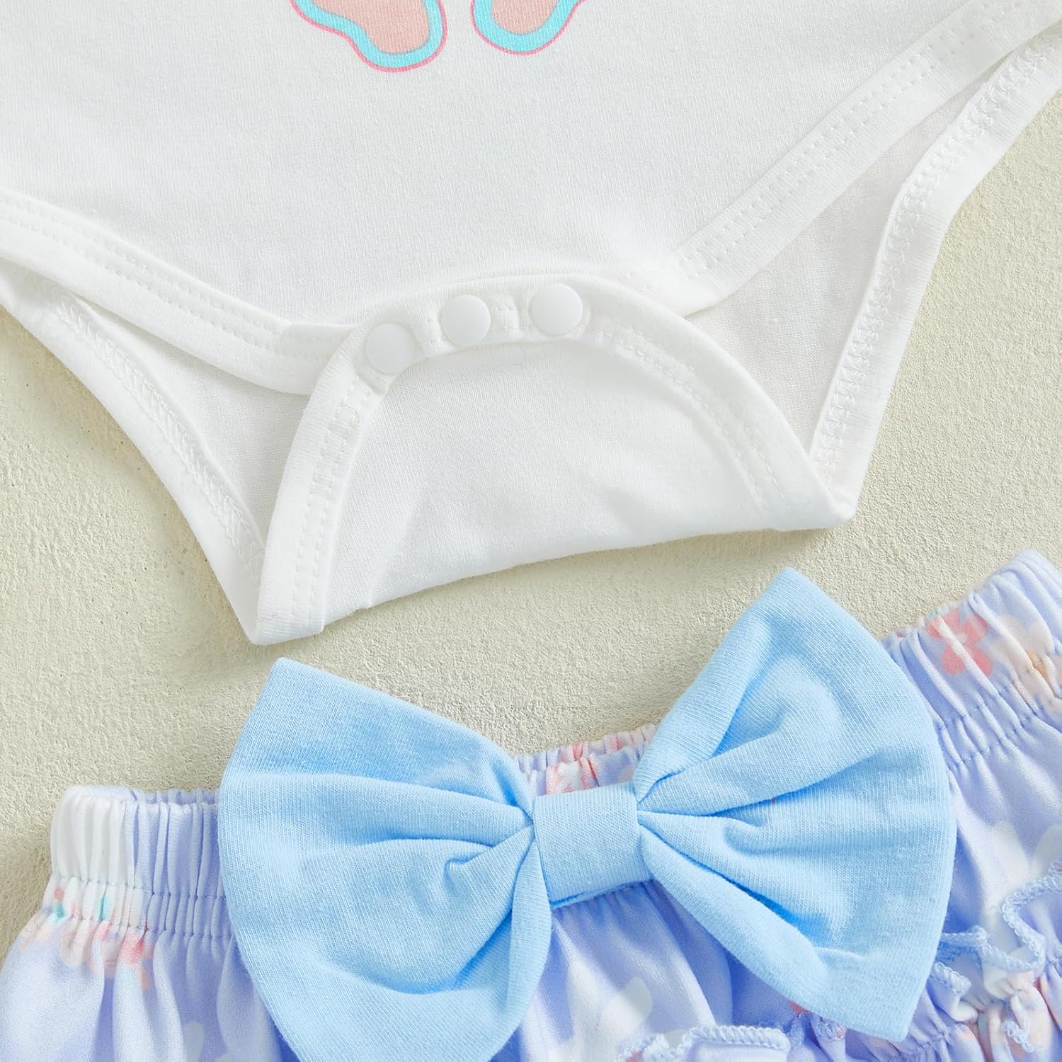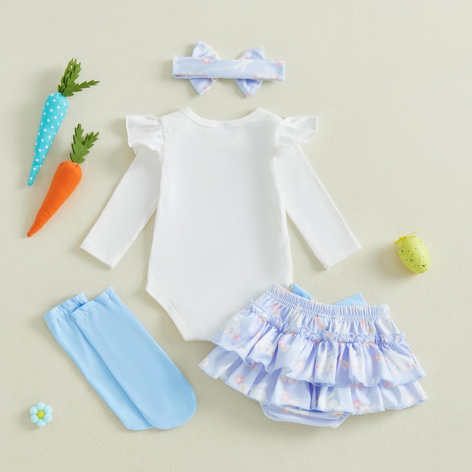 Baby Girls Easter Outfits Long Sleeve Letter Print Romper with Ruffled Shorts + Headband + Long Socks