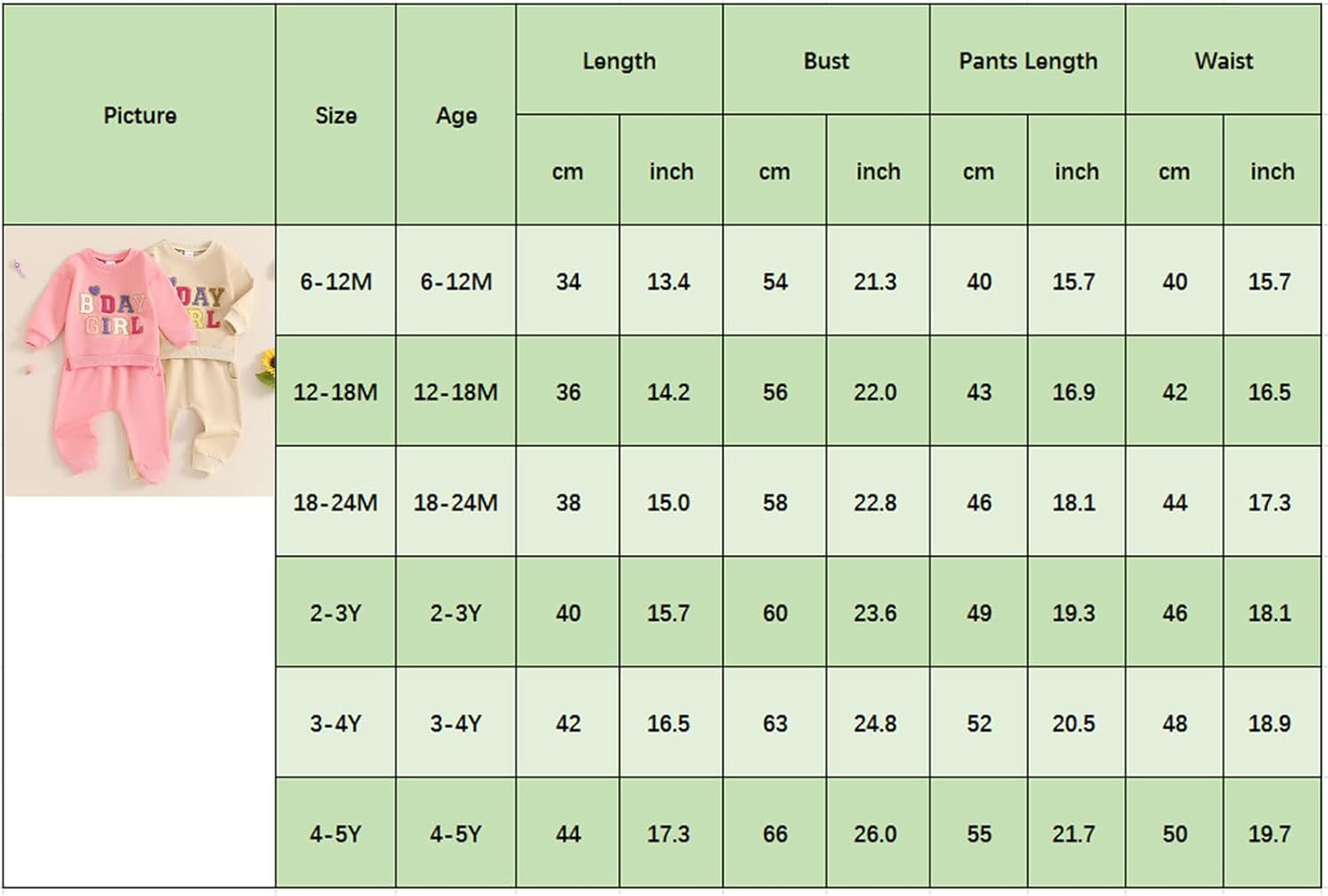 18-24M Tops Length: 14.96 Bust: 23.62 Pants Length: 18.9 Waist: 16.54 Advised Age: 18-24 Months