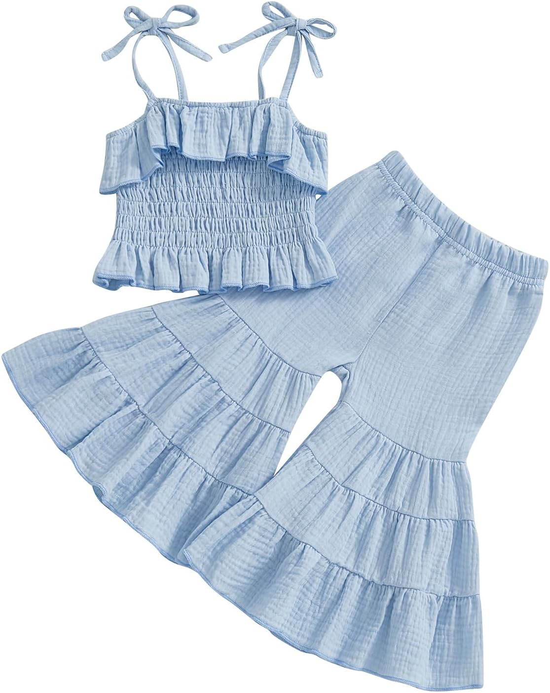Toddler Girl Summer Clothes Smocked Ruffle Camisole Tank Shirts Wide-Leg Flared Pants Set 2Pcs Bell Bottoms Outfit