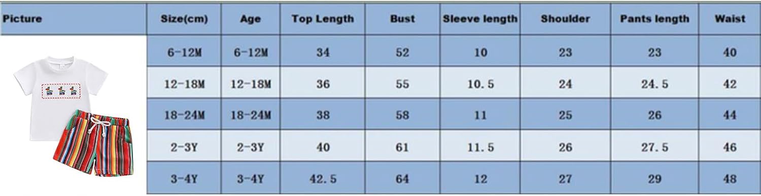 6-12M Tops Length: 13.39 Bust: 20.47 Sleeve: 3.94 Shoulder: 9.06 Shorts Length: 9.06 Waist: 15.75 Advised Age: 6-12 Months