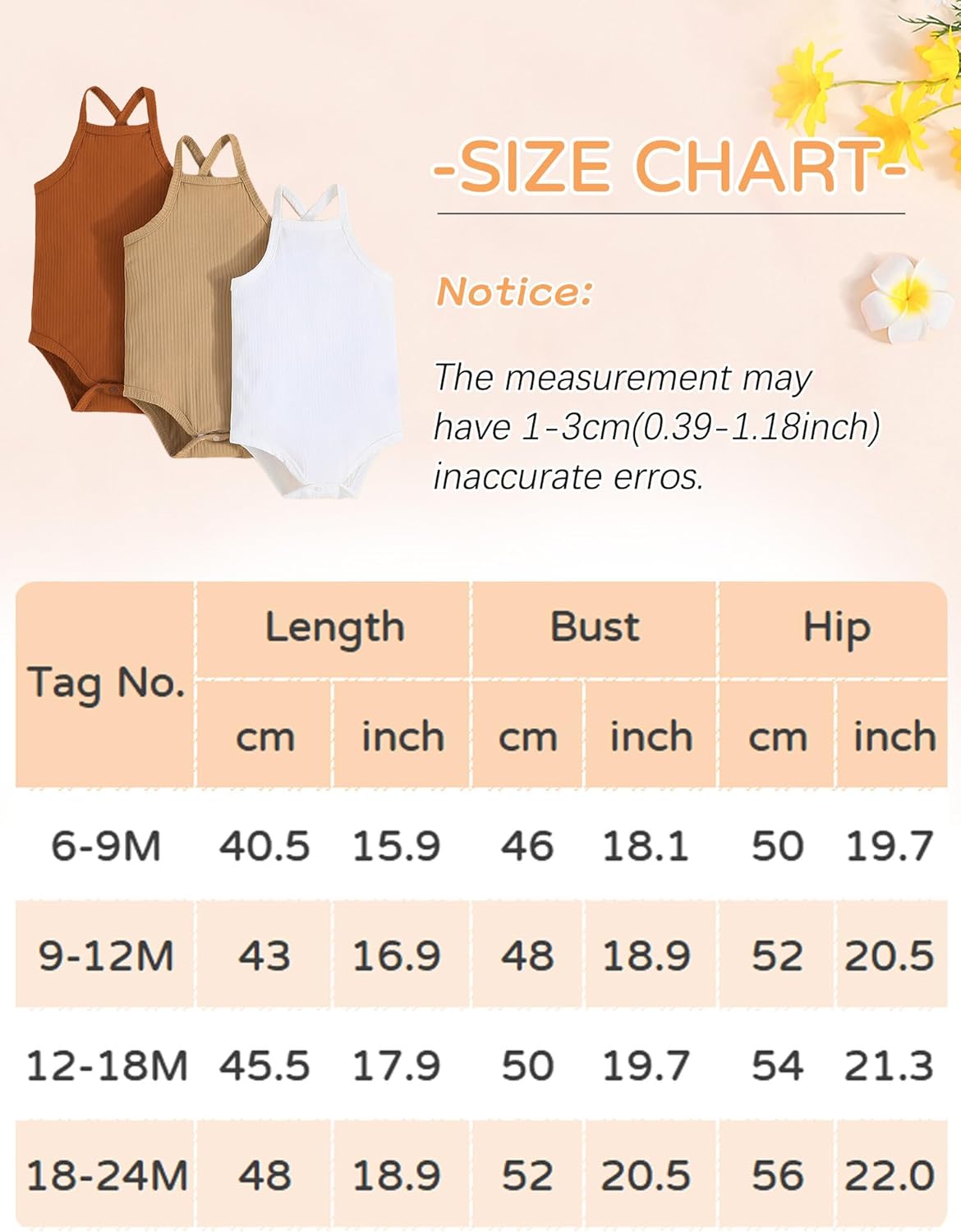 Happy Cherry – 3 Pieces Baby Girl Sleeveless Bodysuit Newborn Infant Summer Vests Casual Outfit Soft Plain Tank Top Strap Shoulder for 6-24 Months