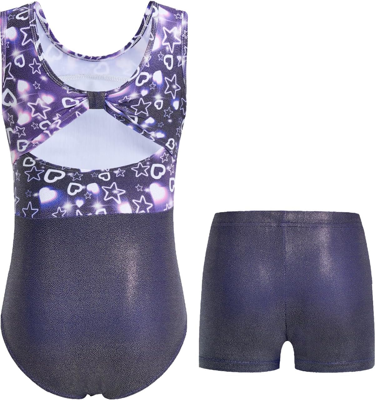 JiAmy Girls Gymnastics Leotards, Gymnastics Outfit Athletic Clothing with Shorts Open Back Bow Ballet Leotards for Kids 3-12 Years