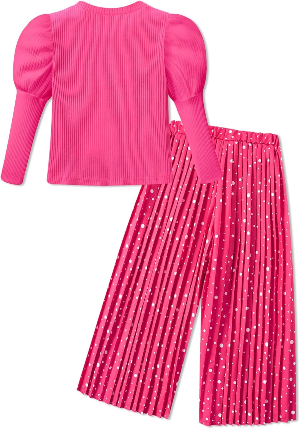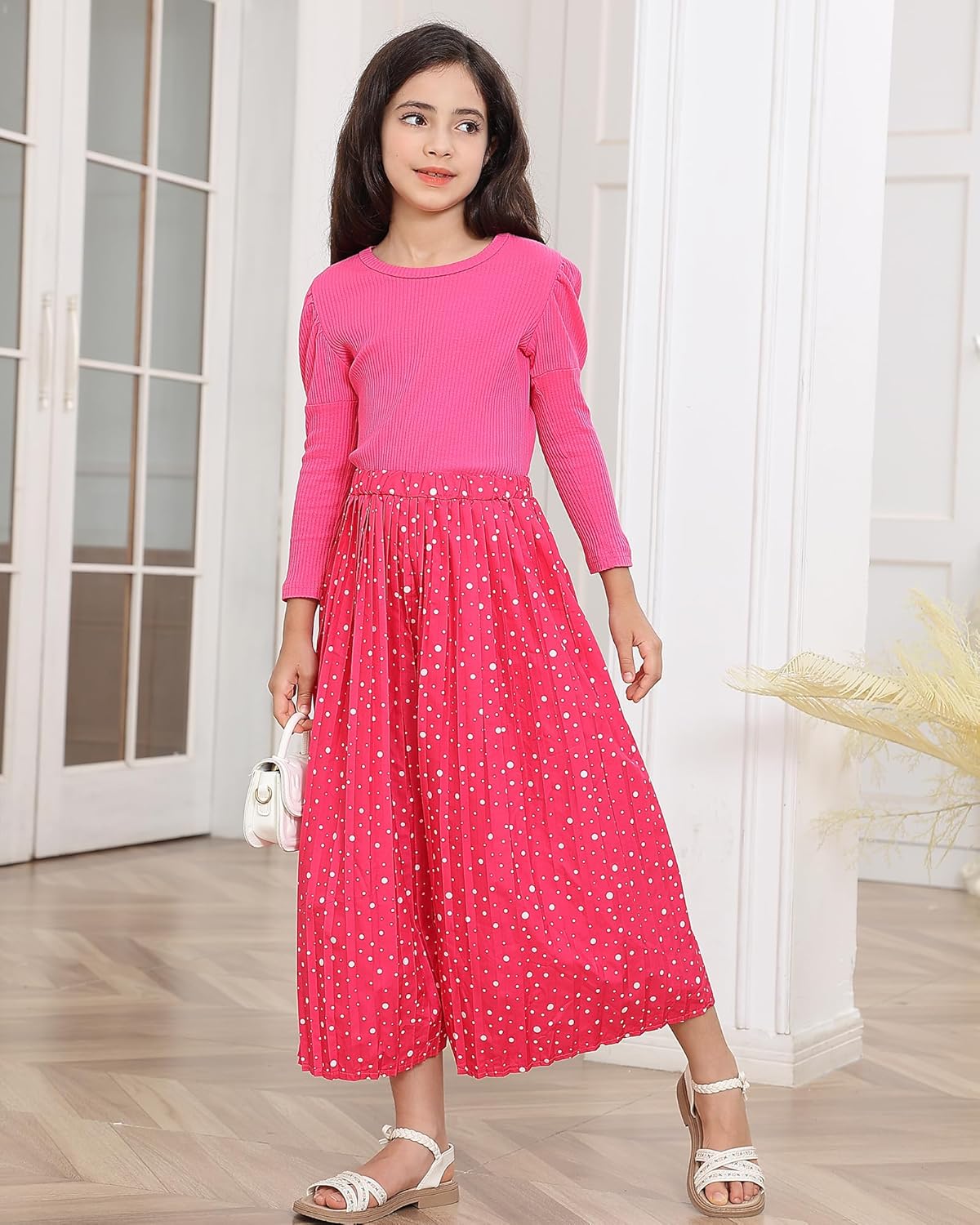 Freshhoodies Girls Clothes Kids Long Sleeves Round Neck Tops + Pleated Pants Outfits Set, 3-7 Years