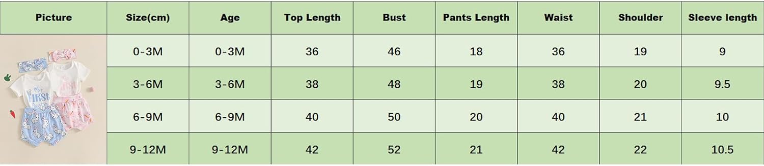 0-3M Tops Length: 14.17 Bust: 18.11 Shoulder: 7.48 Sleeve: 3.54 Pant Length: 7.09 Waist: 14.17 Advised Age: 0-3 Months