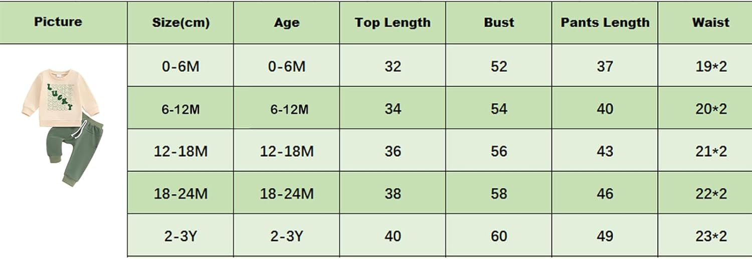 Suggest Age: 6-12 Months Tops Length: 13.39 Bust: 21.26 Pant Length: 16.14 Waist: 14.96